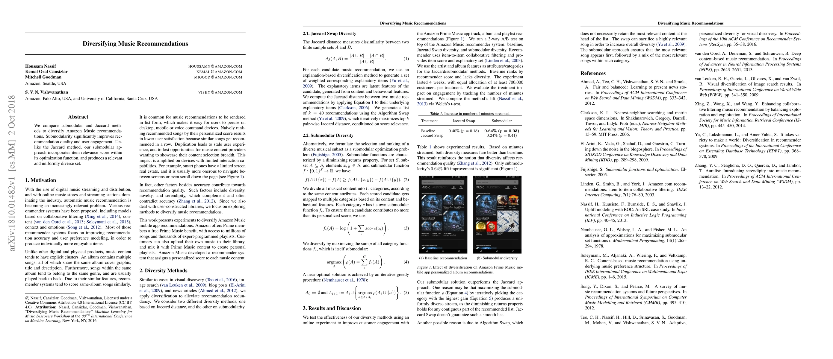 This paper compares submodular and Jaccard methods for diversifying Amazon Music recommendations, finding that submodularity improves recommendation quality and user engagement, producing a diverse and relevant set.