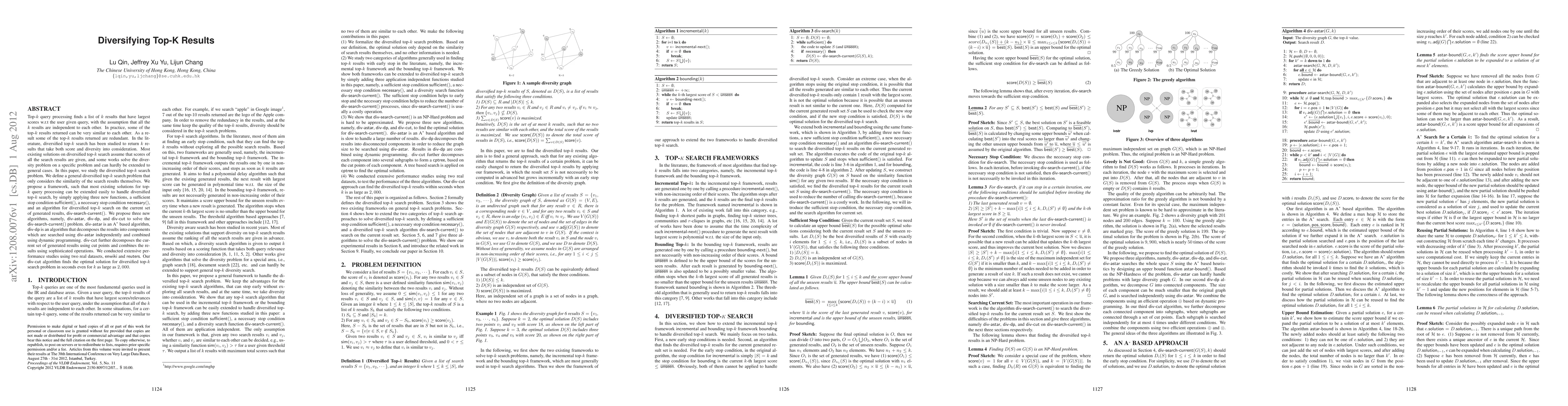 This paper proposes a framework for diversified top-k search that considers both score and diversity of results, introducing three algorithms (div-astar, div-dp, div-cut) to solve the problem. The div-cut algorithm achieves optimal solutions efficiently even for large k values.