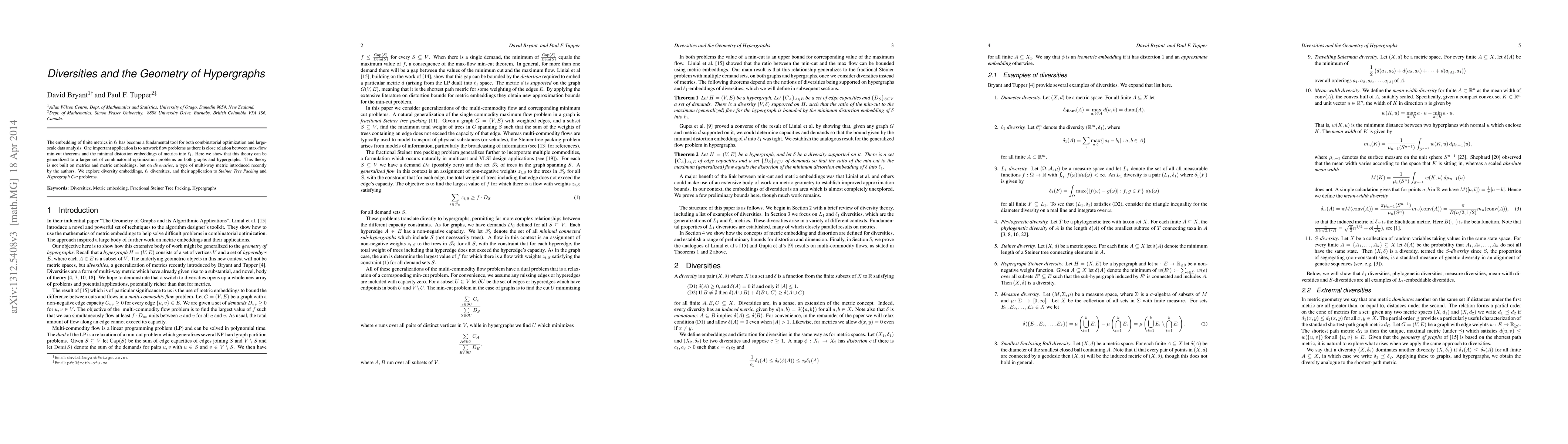 The embedding of finite metrics in $\ell_1$ has become a fundamental tool for both combinatorial optimization and large-scale data analysis. One important application is to network flow problems in which there is close relation between max-flow min-cut theorems and the minimal distortion embeddings of metrics into $\ell_1$. Here we show that this theory can be generalized considerably to encompass Steiner tree packing problems in both graphs and hypergraphs. Instead of the theory of $\ell_1$ metrics and minimal distortion embeddings, the parallel is the theory of diversities recently introduced by Bryant and Tupper, and the corresponding theory of $\ell_1$ diversities and embeddings which we develop here.