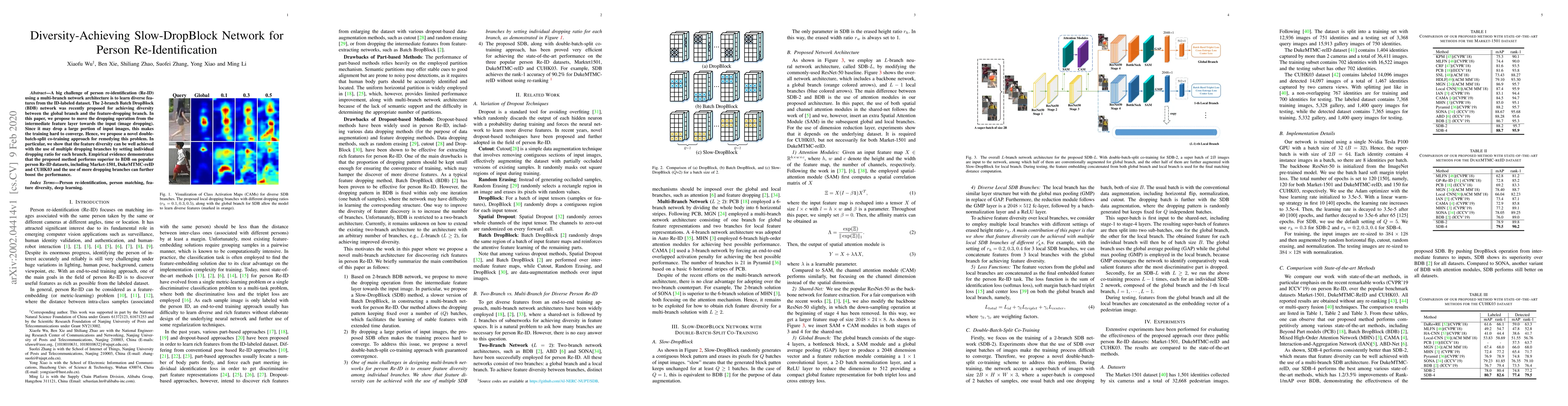 This paper proposes a Diversity-Achieving Slow-DropBlock Network for person re-identification, which shifts the DropBlock operation from feature layers to input images to enhance feature diversity. To address the convergence issue caused by dropping large portions of input images, a double-batch-split co-training approach is introduced, achieving superior performance compared to the original Batch DropBlock method on several Re-ID datasets.