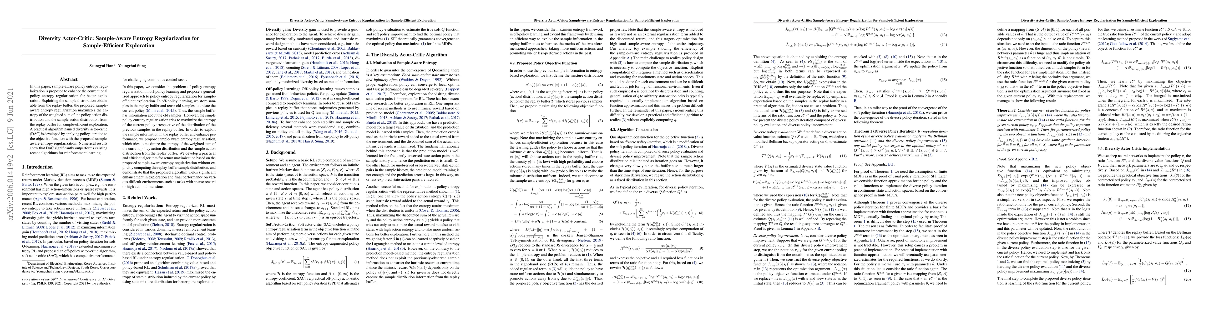 This paper introduces a sample-aware entropy regularization method to improve exploration in reinforcement learning. The proposed Diversity Actor-Critic (DAC) algorithm maximizes the entropy of the weighted policy and replay buffer action distributions, leading to sample-efficient exploration and outperforming existing algorithms.