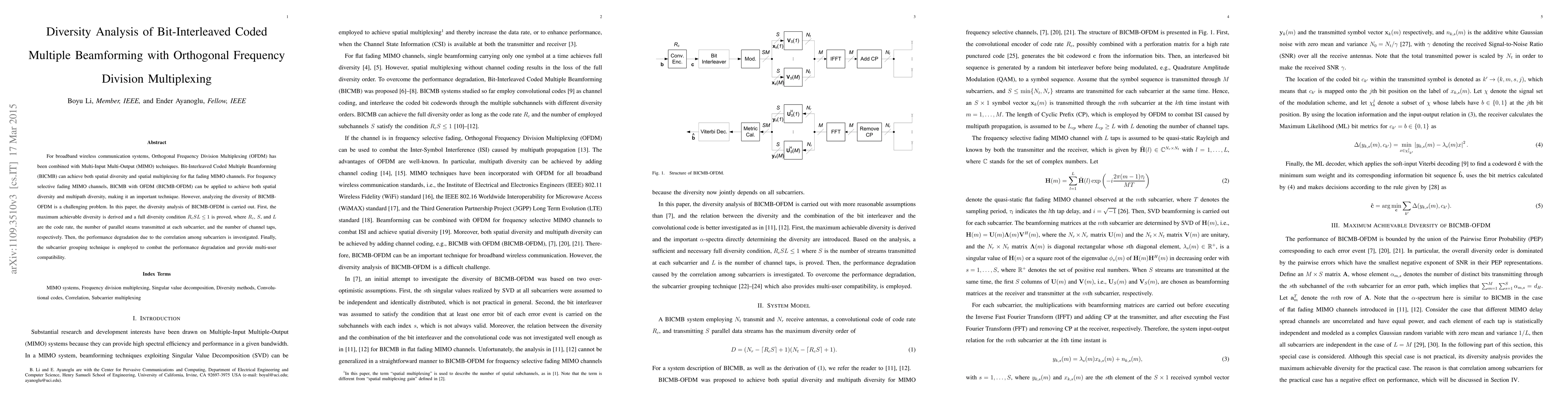 This paper analyzes the diversity of Bit-Interleaved Coded Multiple Beamforming with Orthogonal Frequency Division Multiplexing (BICMB-OFDM) for wireless communication. It derives the maximum achievable diversity and proves a full diversity condition, while investigating performance degradation due to subcarrier correlation and employing subcarrier grouping to improve multi-user compatibility.