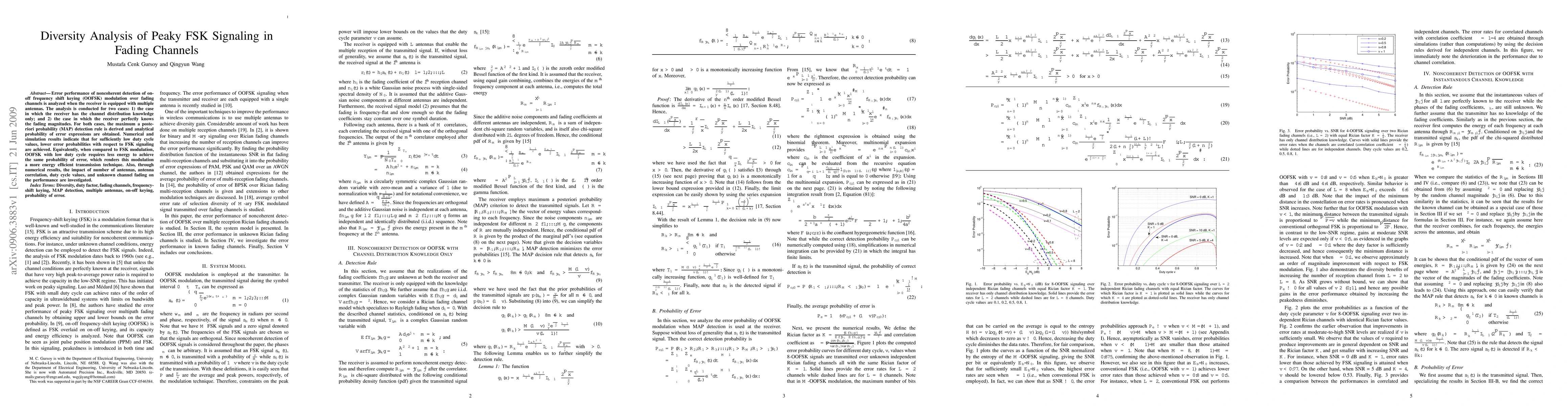 This paper analyzes the error performance of noncoherent detection of on-off frequency shift keying (OOFSK) over fading channels with multiple antennas. It derives maximum a posteriori probability detection rules and error probability expressions under different channel knowledge scenarios, showing that OOFSK with low duty cycles is more energy-efficient than FSK.
