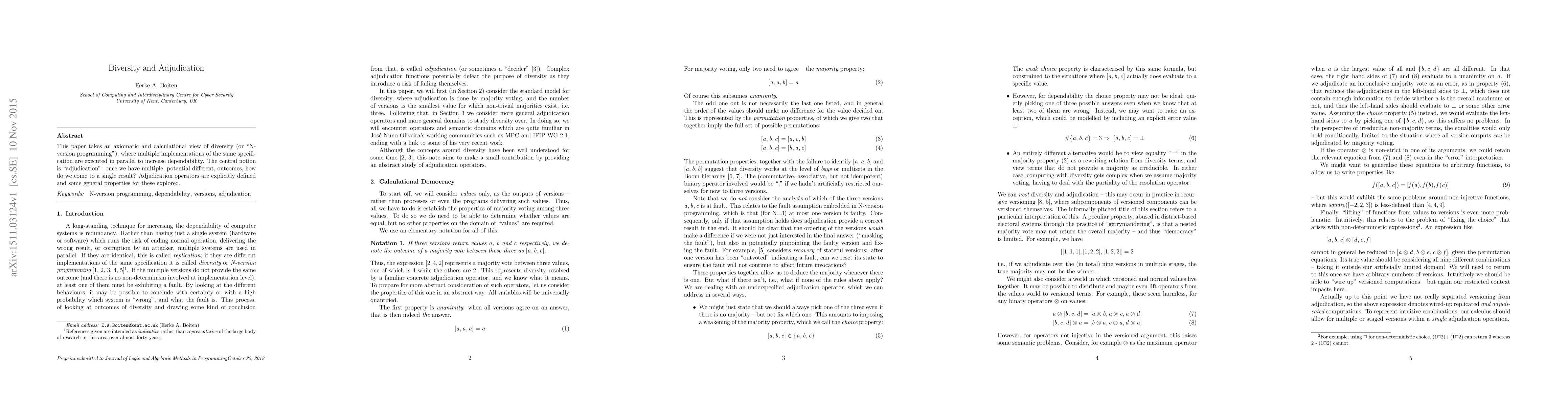 This paper takes an axiomatic and calculational view of diversity (or "N-version programming"), where multiple implementations of the same specification are executed in parallel to increase dependability. The central notion is "adjudication": once we have multiple, potential different, outcomes, how do we come to a single result? Adjudication operators are explicitly defined and some general properties for these explored.