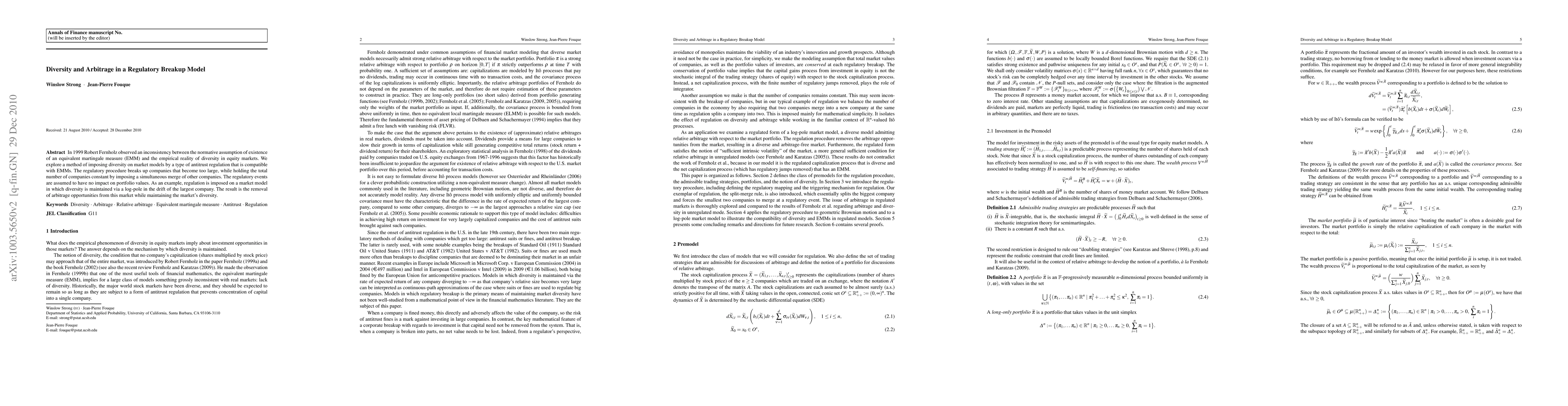 The paper introduces a regulatory breakup model that maintains diversity and eliminates arbitrage opportunities, providing a framework for understanding the interaction between market regulation and financial market dynamics.