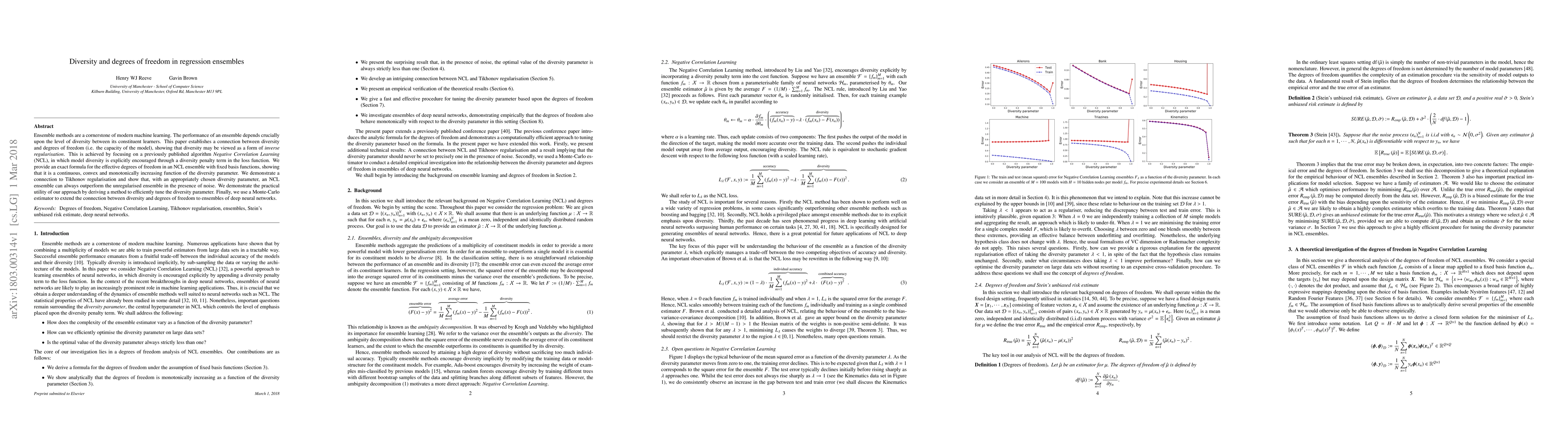 Ensemble methods are a cornerstone of modern machine learning. The performance of an ensemble depends crucially upon the level of diversity between its constituent learners. This paper establishes a connection between diversity and degrees of freedom (i.e. the capacity of the model), showing that diversity may be viewed as a form of inverse regularisation. This is achieved by focusing on a previously published algorithm Negative Correlation Learning (NCL), in which model diversity is explicitly encouraged through a diversity penalty term in the loss function. We provide an exact formula for the effective degrees of freedom in an NCL ensemble with fixed basis functions, showing that it is a continuous, convex and monotonically increasing function of the diversity parameter. We demonstrate a connection to Tikhonov regularisation and show that, with an appropriately chosen diversity parameter, an NCL ensemble can always outperform the unregularised ensemble in the presence of noise. We demonstrate the practical utility of our approach by deriving a method to efficiently tune the diversity parameter. Finally, we use a Monte-Carlo estimator to extend the connection between diversity and degrees of freedom to ensembles of deep neural networks.