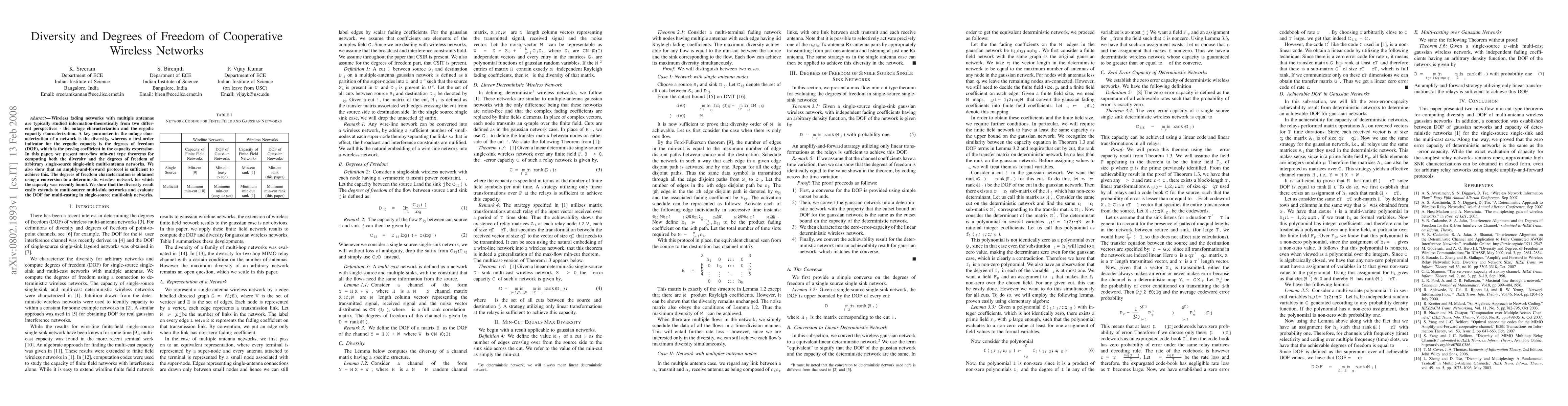 This paper presents theorems for computing diversity and degrees of freedom (DOF) in multi-antenna wireless networks, showing that an amplify-and-forward protocol suffices. The DOF characterization is derived by converting the network to a deterministic form, and the diversity result extends to multi-source multi-sink configurations.