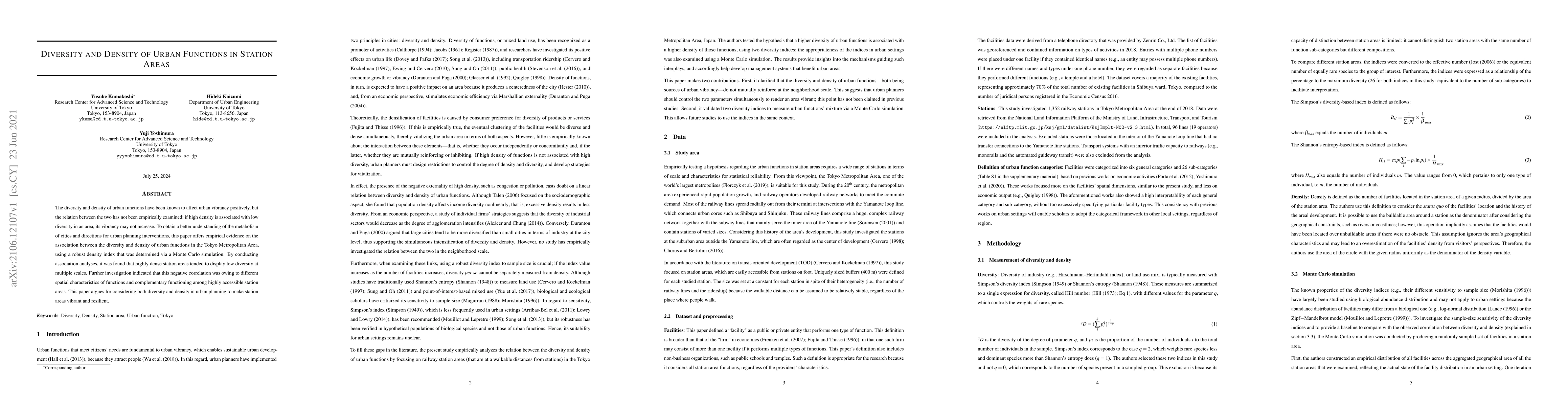 This paper examines the relationship between the diversity and density of urban functions in Tokyo's station areas, finding that high density often correlates with low diversity. It suggests that urban planning should consider both factors to enhance vibrancy and resilience in these areas.