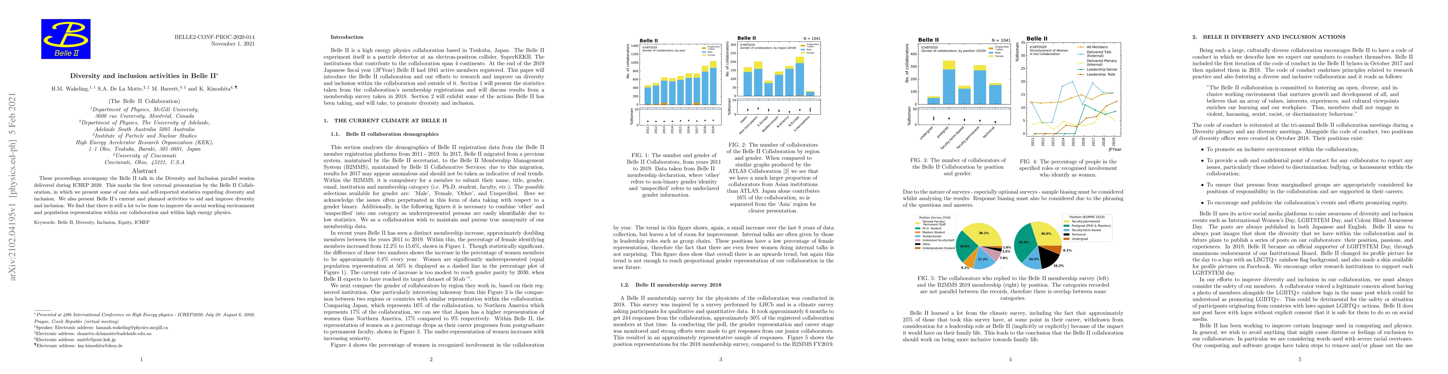 The Belle II Collaboration found room for improvement in diversity and inclusion, citing a need to enhance social working environments and population representation within the field of high energy physics. The collaboration has implemented and plans activities to address these areas.