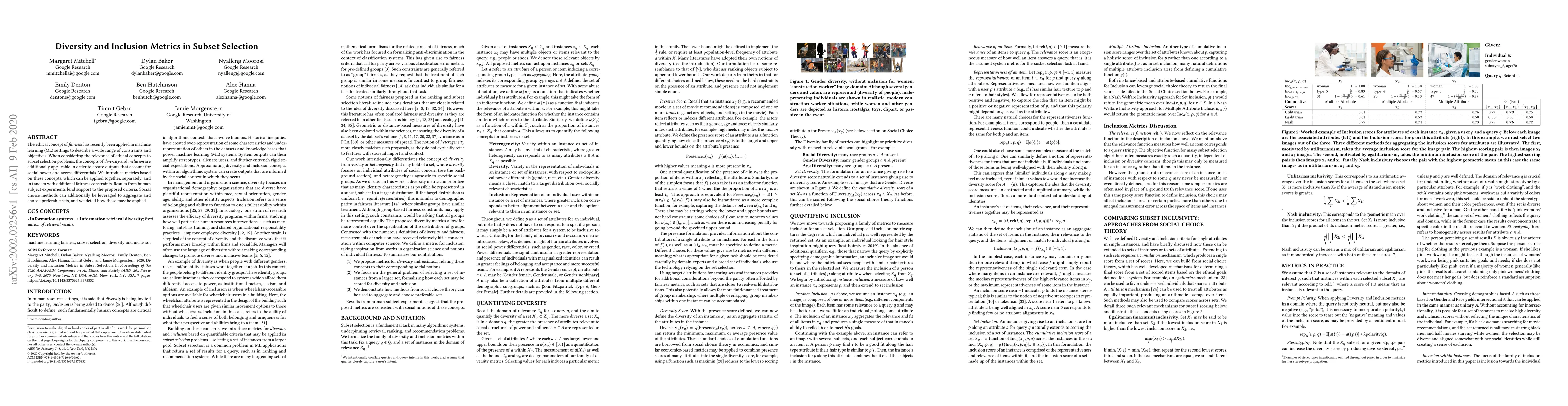 The ethical concept of fairness has recently been applied in machine learning (ML) settings to describe a wide range of constraints and objectives. When considering the relevance of ethical concepts to subset selection problems, the concepts of diversity and inclusion are additionally applicable in order to create outputs that account for social power and access differentials. We introduce metrics based on these concepts, which can be applied together, separately, and in tandem with additional fairness constraints. Results from human subject experiments lend support to the proposed criteria. Social choice methods can additionally be leveraged to aggregate and choose preferable sets, and we detail how these may be applied.