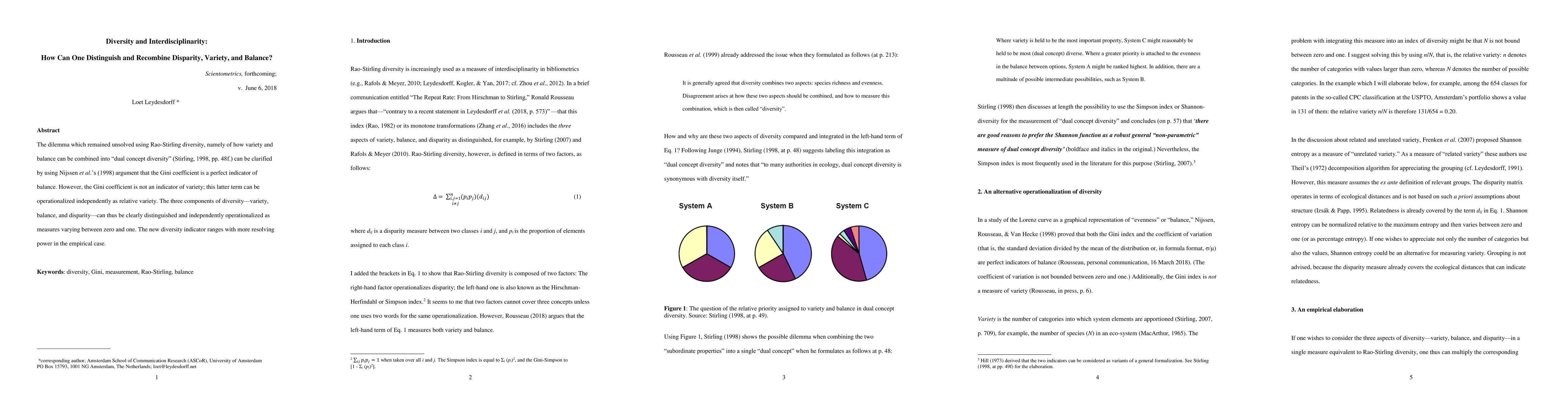 The dilemma which remained unsolved using Rao-Stirling diversity, namely of how variety and balance can be combined into "dual concept diversity" (Stirling, 1998, pp. 48f.) can be clarified by using Nijssen et al.'s (1998) argument that the Gini coefficient is a perfect indicator of balance. However, the Gini coefficient is not an indicator of variety; this latter term can be operationalized independently as relative variety. The three components of diversity--variety, balance, and disparity--can thus be clearly distinguished and independently operationalized as measures varying between zero and one. The new diversity indicator ranges with more resolving power in the empirical case.