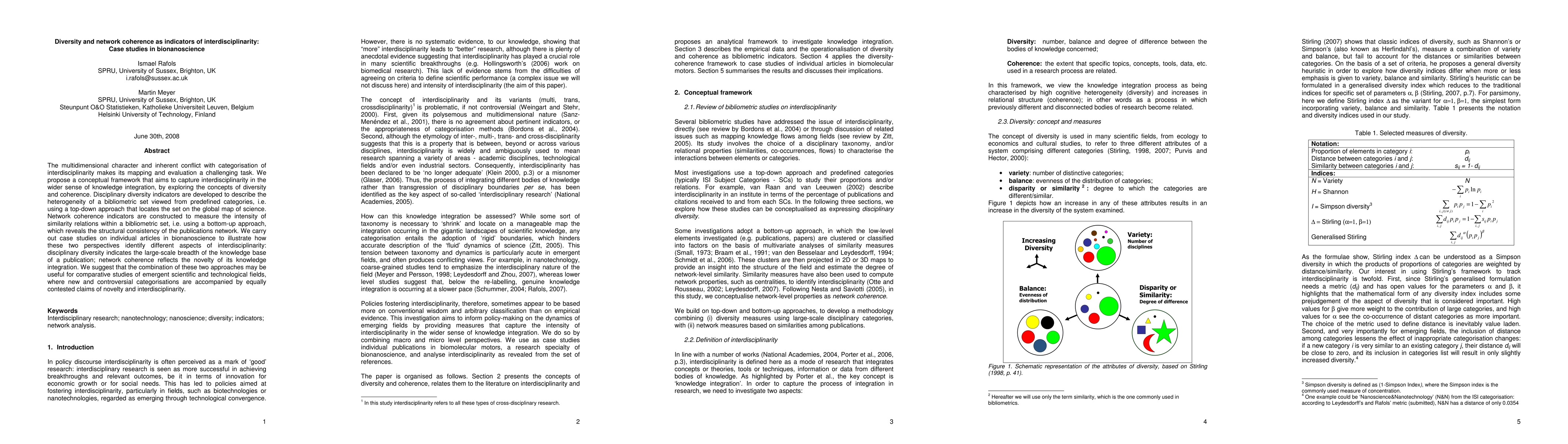 This paper proposes a conceptual framework to assess interdisciplinarity using diversity and coherence indicators. It employs disciplinary diversity to gauge the breadth of knowledge and network coherence to measure knowledge integration, illustrated through bionanoscience case studies.