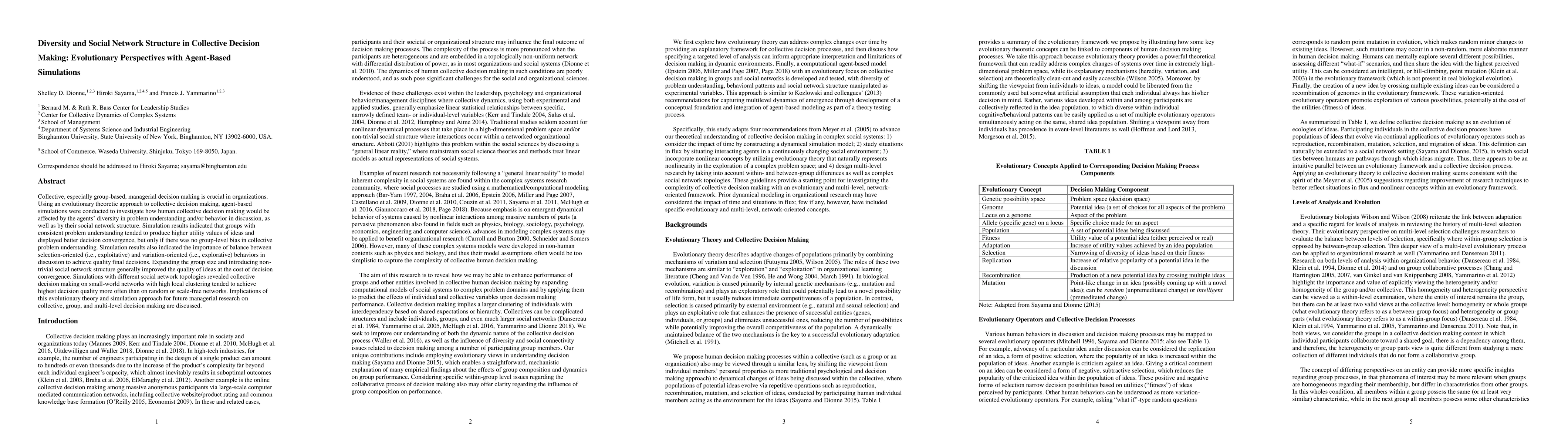 Collective, especially group-based, managerial decision making is crucial in organizations. Using an evolutionary theoretic approach to collective decision making, agent-based simulations were conducted to investigate how human collective decision making would be affected by the agents' diversity in problem understanding and/or behavior in discussion, as well as by their social network structure. Simulation results indicated that groups with consistent problem understanding tended to produce higher utility values of ideas and displayed better decision convergence, but only if there was no group-level bias in collective problem understanding. Simulation results also indicated the importance of balance between selection-oriented (i.e., exploitative) and variation-oriented (i.e., explorative) behaviors in discussion to achieve quality final decisions. Expanding the group size and introducing non-trivial social network structure generally improved the quality of ideas at the cost of decision convergence. Simulations with different social network topologies revealed collective decision making on small-world networks with high local clustering tended to achieve highest decision quality more often than on random or scale-free networks. Implications of this evolutionary theory and simulation approach for future managerial research on collective, group, and multi-level decision making are discussed.
