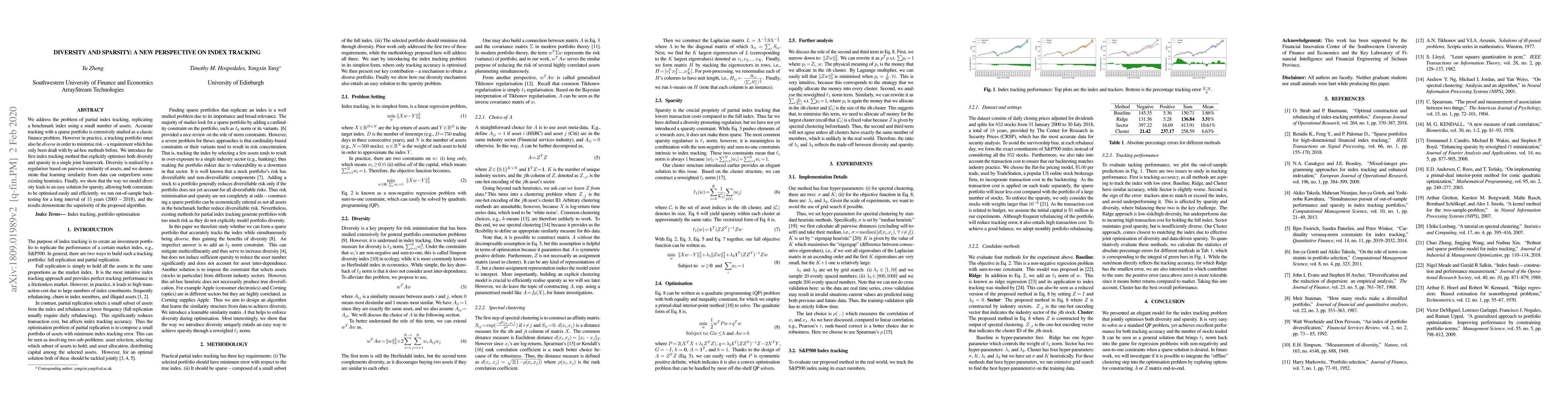 Researchers develop a new index tracking method that optimizes both diversification and sparsity in portfolio construction, achieving better performance than existing heuristics through machine learning-based similarity measurement.