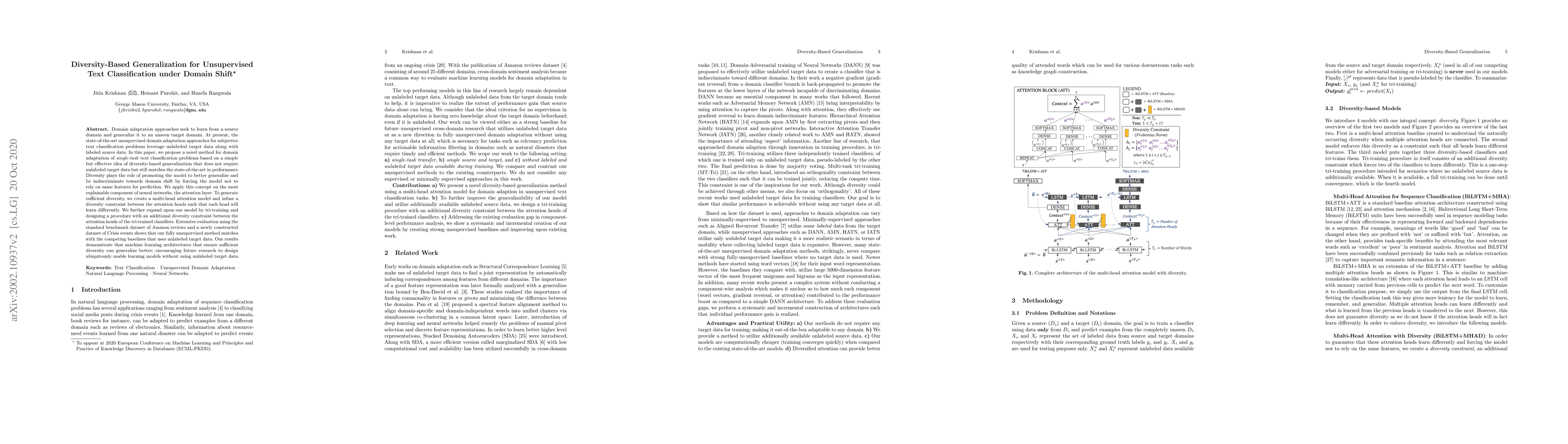 Domain adaptation approaches seek to learn from a source domain and generalize it to an unseen target domain. At present, the state-of-the-art unsupervised domain adaptation approaches for subjective text classification problems leverage unlabeled target data along with labeled source data. In this paper, we propose a novel method for domain adaptation of single-task text classification problems based on a simple but effective idea of diversity-based generalization that does not require unlabeled target data but still matches the state-of-the-art in performance. Diversity plays the role of promoting the model to better generalize and be indiscriminate towards domain shift by forcing the model not to rely on same features for prediction. We apply this concept on the most explainable component of neural networks, the attention layer. To generate sufficient diversity, we create a multi-head attention model and infuse a diversity constraint between the attention heads such that each head will learn differently. We further expand upon our model by tri-training and designing a procedure with an additional diversity constraint between the attention heads of the tri-trained classifiers. Extensive evaluation using the standard benchmark dataset of Amazon reviews and a newly constructed dataset of Crisis events shows that our fully unsupervised method matches with the competing baselines that uses unlabeled target data. Our results demonstrate that machine learning architectures that ensure sufficient diversity can generalize better; encouraging future research to design ubiquitously usable learning models without using unlabeled target data.