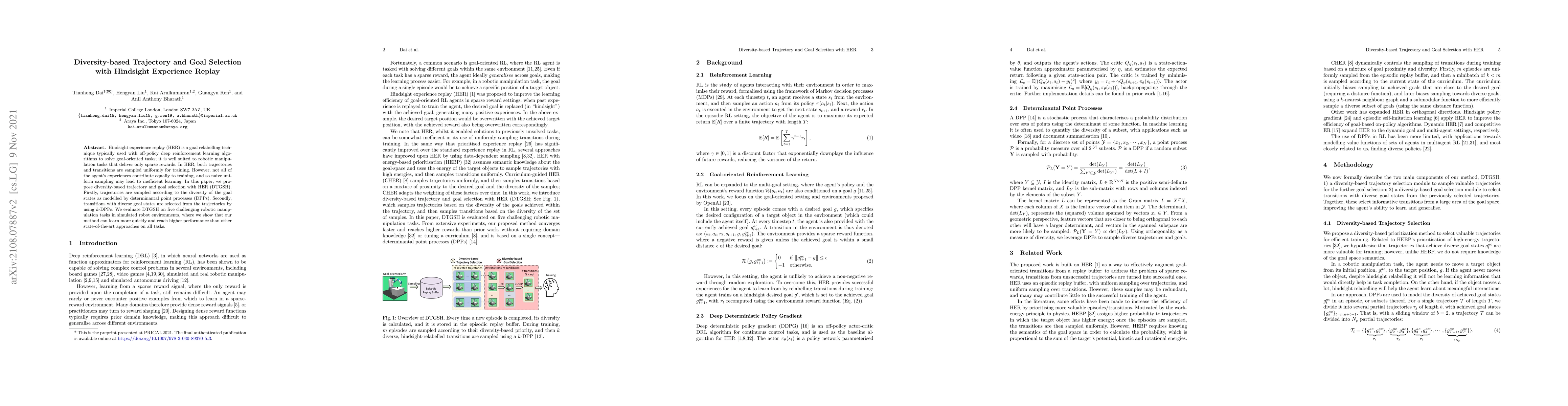 This paper introduces a method called diversity-based trajectory and goal selection with hindsight experience replay (DTGSH) to enhance learning efficiency in reinforcement learning for robotic manipulation. It samples trajectories based on goal state diversity and selects transitions using k-DPPs, achieving faster learning and higher performance across various tasks.