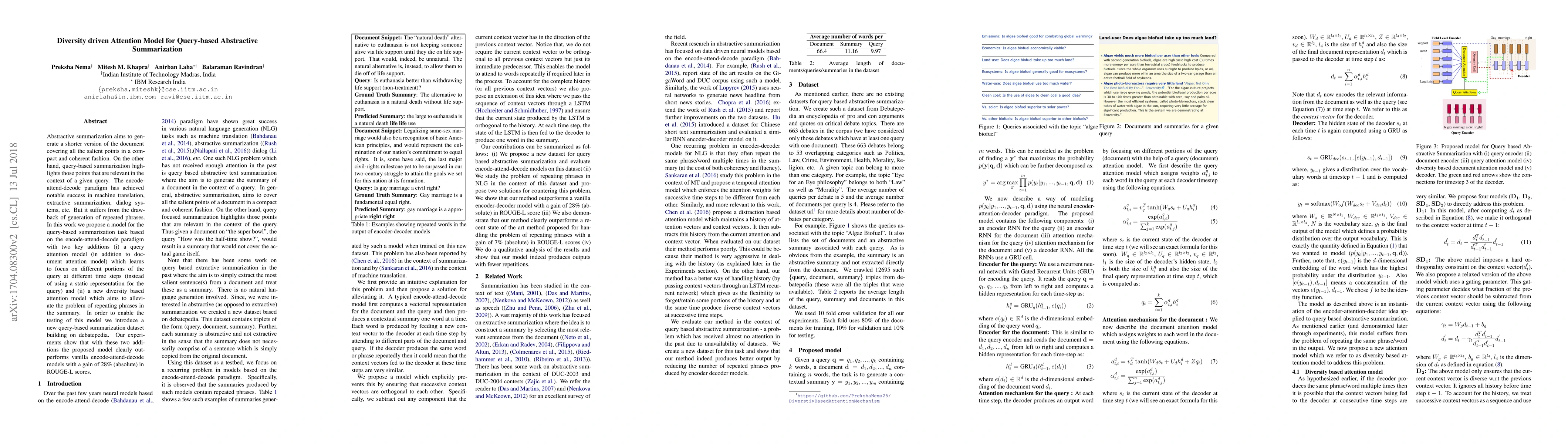 Abstractive summarization aims to generate a shorter version of the document covering all the salient points in a compact and coherent fashion. On the other hand, query-based summarization highlights those points that are relevant in the context of a given query. The encode-attend-decode paradigm has achieved notable success in machine translation, extractive summarization, dialog systems, etc. But it suffers from the drawback of generation of repeated phrases. In this work we propose a model for the query-based summarization task based on the encode-attend-decode paradigm with two key additions (i) a query attention model (in addition to document attention model) which learns to focus on different portions of the query at different time steps (instead of using a static representation for the query) and (ii) a new diversity based attention model which aims to alleviate the problem of repeating phrases in the summary. In order to enable the testing of this model we introduce a new query-based summarization dataset building on debatepedia. Our experiments show that with these two additions the proposed model clearly outperforms vanilla encode-attend-decode models with a gain of 28% (absolute) in ROUGE-L scores.