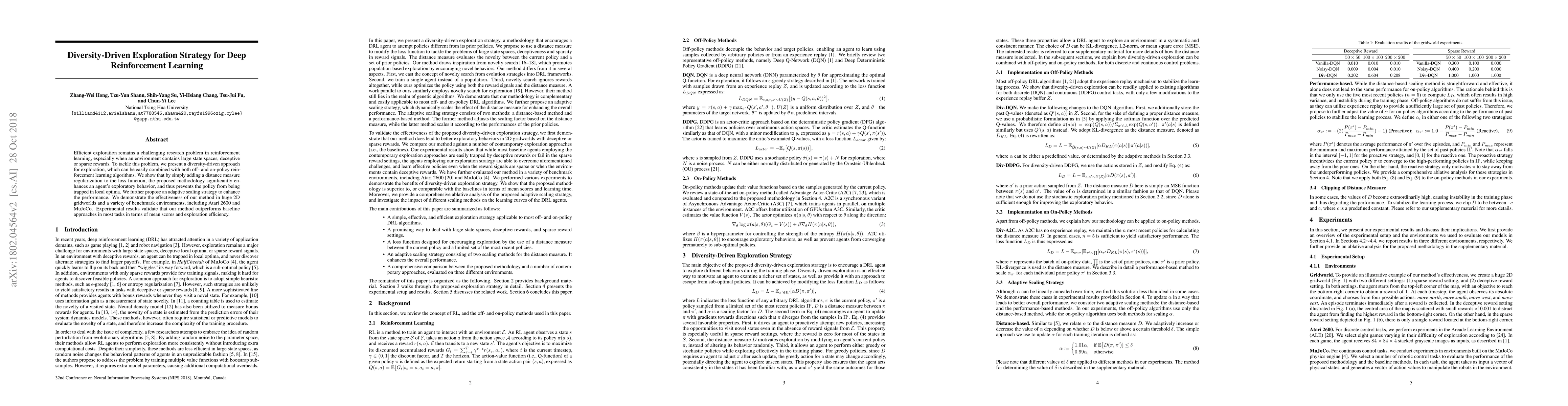 This paper proposes a diversity-driven exploration strategy for deep reinforcement learning that enhances an agent's exploratory behavior by incorporating a distance measure into the loss function, preventing local optima traps. The method also includes an adaptive scaling technique for stable learning, outperforming baselines in Atari 2600 tasks.