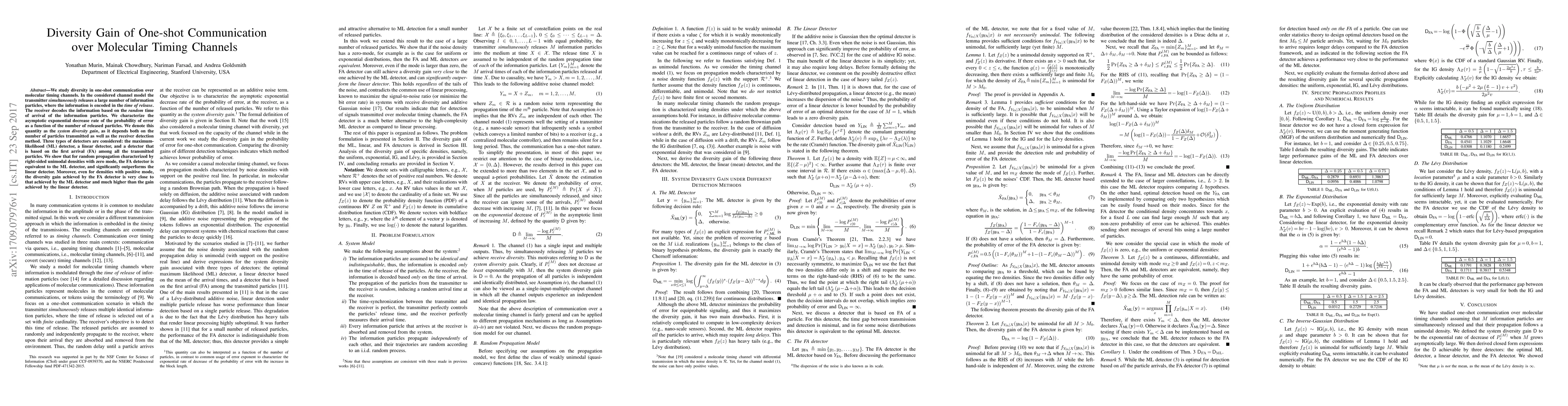 We study diversity in one-shot communication over molecular timing channels. In the considered channel model the transmitter simultaneously releases a large number of information particles, where the information is encoded in the time of release. The receiver decodes the information based on the random time of arrival of the information particles. We characterize the asymptotic exponential decrease rate of the probability of error as a function of the number of released particles. We denote this quantity as the system diversity gain, as it depends both on the number of particles transmitted as well as the receiver detection method. Three types of detectors are considered: the maximumlikelihood (ML) detector, a linear detector, and a detector that is based on the first arrival (FA) among all the transmitted particles. We show that for random propagation characterized by right-sided unimodal densities with zero mode, the FA detector is equivalent to the ML detector, and significantly outperforms the linear detector. Moreover, even for densities with positive mode, the diversity gain achieved by the FA detector is very close to that achieved by the ML detector and much higher than the gain achieved by the linear detector.