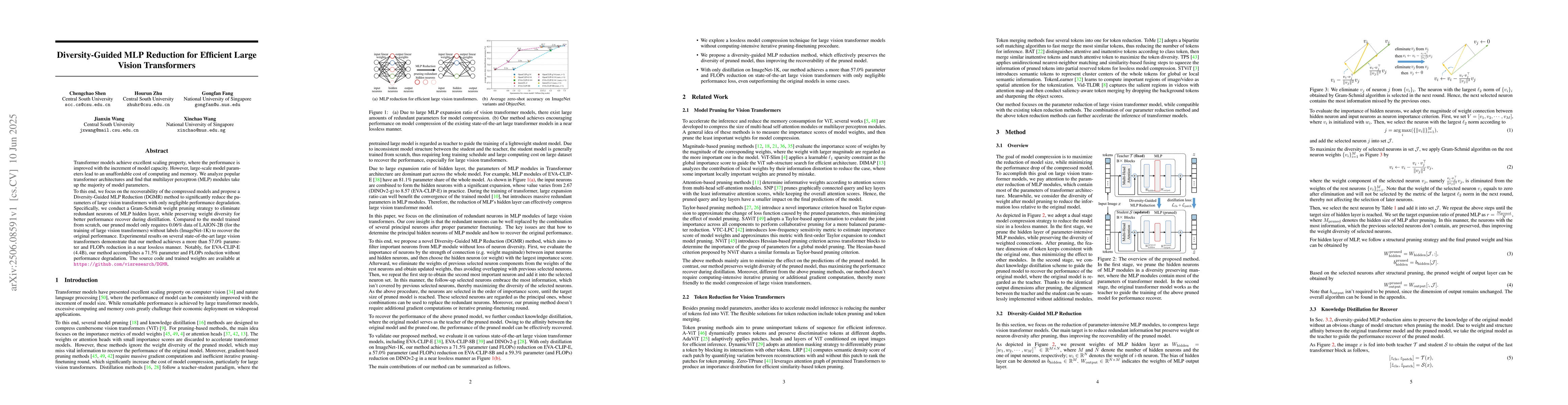 Transformer models achieve excellent scaling property, where the performance is improved with the increment of model capacity. However, large-scale model parameters lead to an unaffordable cost of computing and memory. We analyze popular transformer architectures and find that multilayer perceptron (MLP) modules take up the majority of model parameters. To this end, we focus on the recoverability of the compressed models and propose a Diversity-Guided MLP Reduction (DGMR) method to significantly reduce the parameters of large vision transformers with only negligible performance degradation. Specifically, we conduct a Gram-Schmidt weight pruning strategy to eliminate redundant neurons of MLP hidden layer, while preserving weight diversity for better performance recover during distillation. Compared to the model trained from scratch, our pruned model only requires 0.06\% data of LAION-2B (for the training of large vision transformers) without labels (ImageNet-1K) to recover the original performance. Experimental results on several state-of-the-art large vision transformers demonstrate that our method achieves a more than 57.0\% parameter and FLOPs reduction in a near lossless manner. Notably, for EVA-CLIP-E (4.4B), our method accomplishes a 71.5\% parameter and FLOPs reduction without performance degradation. The source code and trained weights are available at https://github.com/visresearch/DGMR.