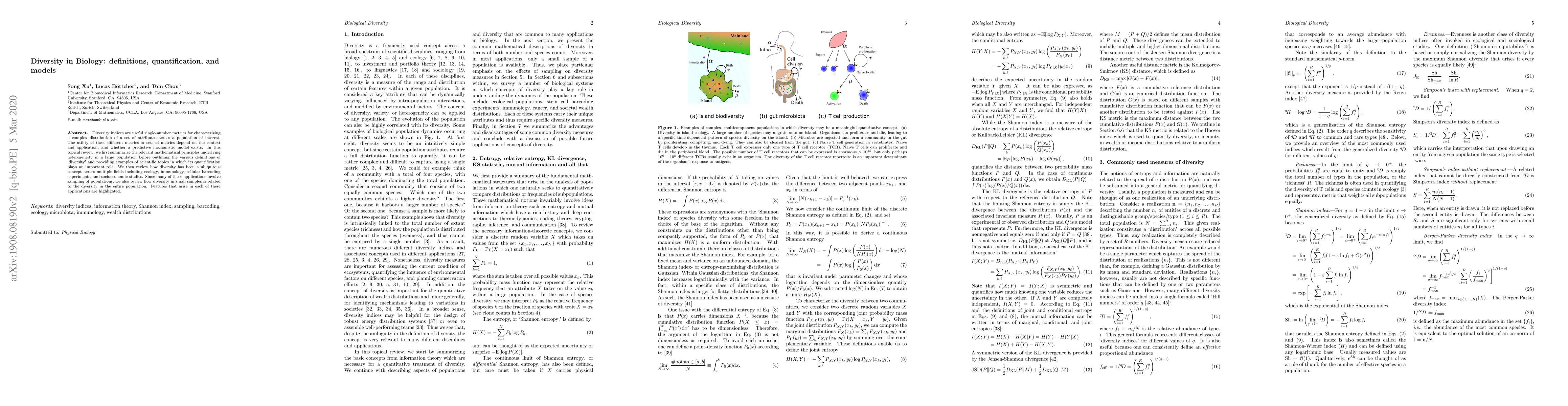 This paper reviews diversity indices in biology, explaining their definitions, quantification methods, and applications across various fields including ecology, immunology, and socioeconomic studies. It highlights the importance of diverse metrics depending on context and application.