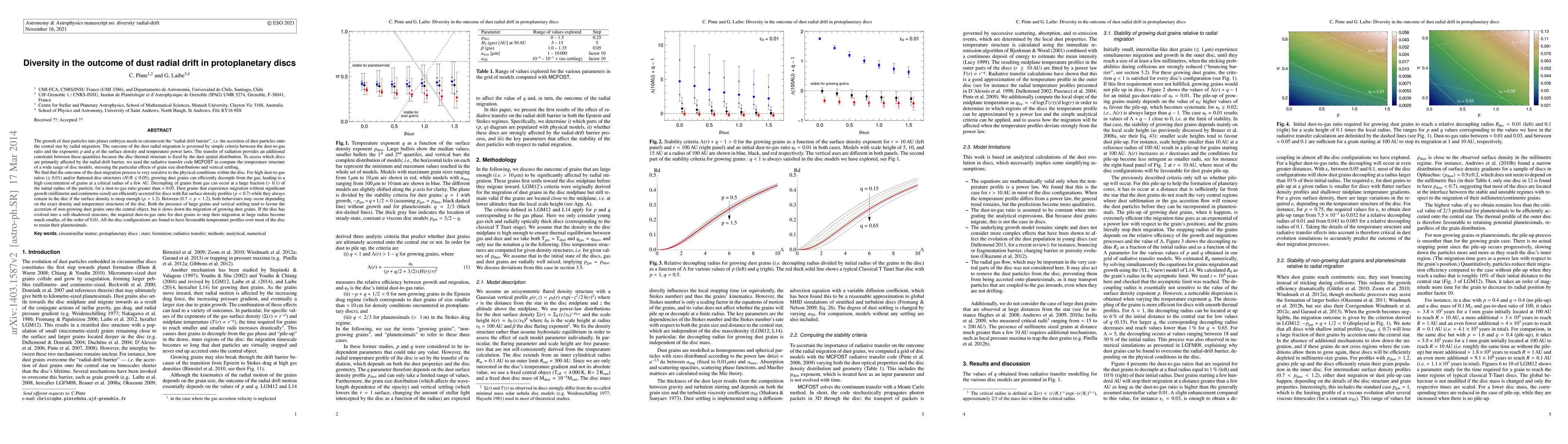 This research uses the radiative transfer code MCFOST to analyze disc models, finding that dust migration outcome is sensitive to disc conditions. High dust-to-gas ratios (>0.01) or flattened discs (H/R < 0.05) can concentrate grains at a few AU, while non-growing grains are accreted in discs with shallow surface density (p<0.7), and growing grains remain in discs with steep profiles (p>1.2). Large grains and settling favor accretion but slow growing grain migration, with most profiles favoring planetesimal retention.