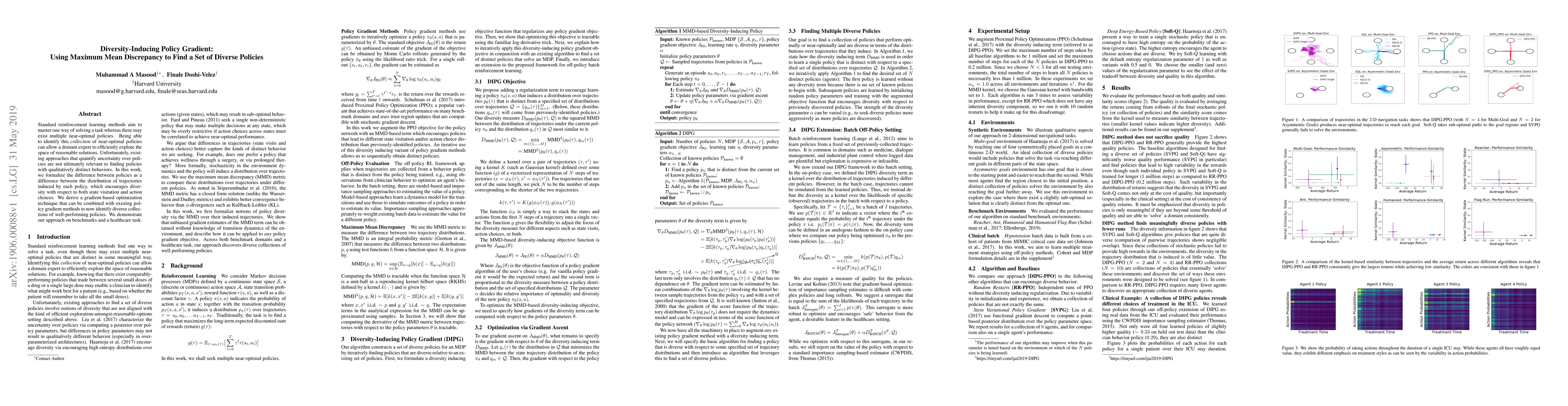 This paper proposes a diversity-inducing policy gradient method using Maximum Mean Discrepancy to identify multiple near-optimal policies with distinct behaviors. The approach optimizes policy gradients to encourage diverse state visitation and action choices, demonstrating effectiveness on benchmarks and a healthcare task.