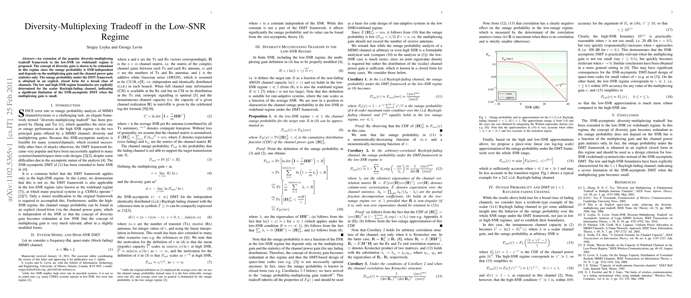 This paper extends the diversity-multiplexing tradeoff framework to the low-SNR regime, demonstrating that diversity gain is redundant as outage probability becomes SNR-independent. The study provides an explicit, closed-form expression for outage probability under the DMT framework for various channels, highlighting the limitations of traditional SNR-asymptotic DMT in low-SNR scenarios.