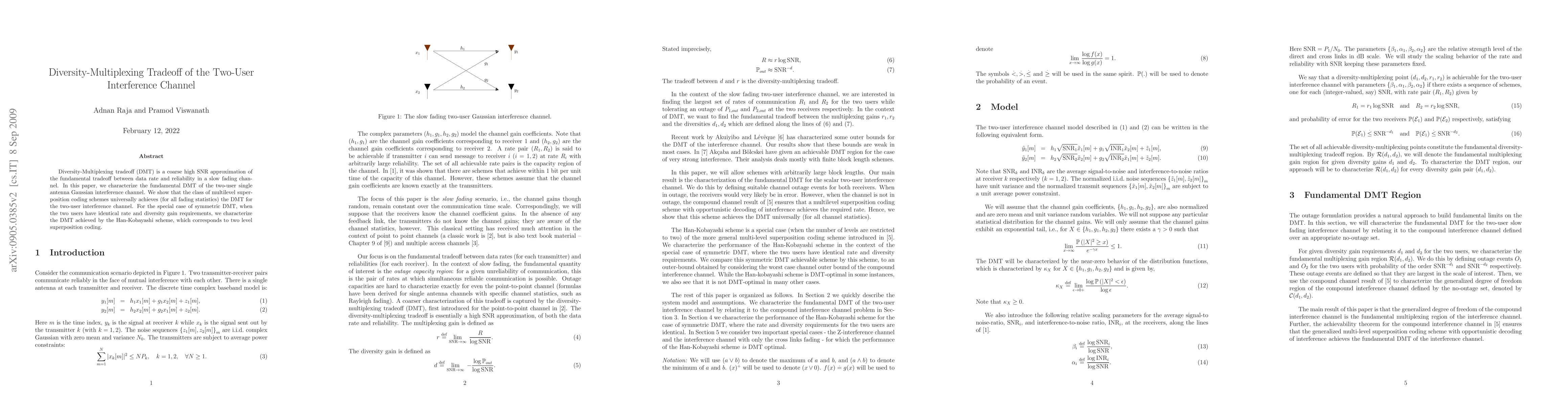 Diversity-Multiplexing tradeoff (DMT) is a coarse high SNR approximation of the fundamental tradeoff between data rate and reliability in a slow fading channel. In this paper, we characterize the fundamental DMT of the two user single antenna Gaussian interference channel. We show that the class of multilevel superposition coding schemes universally achieves (for all fading statistics) the DMT for the two-user interference channel. For the special case of symmetric DMT, when the two users have identical rate and diversity gain requirements, we characterize the DMT achieved by the Han-Kobayashi scheme, which corresponds to two level superposition coding.