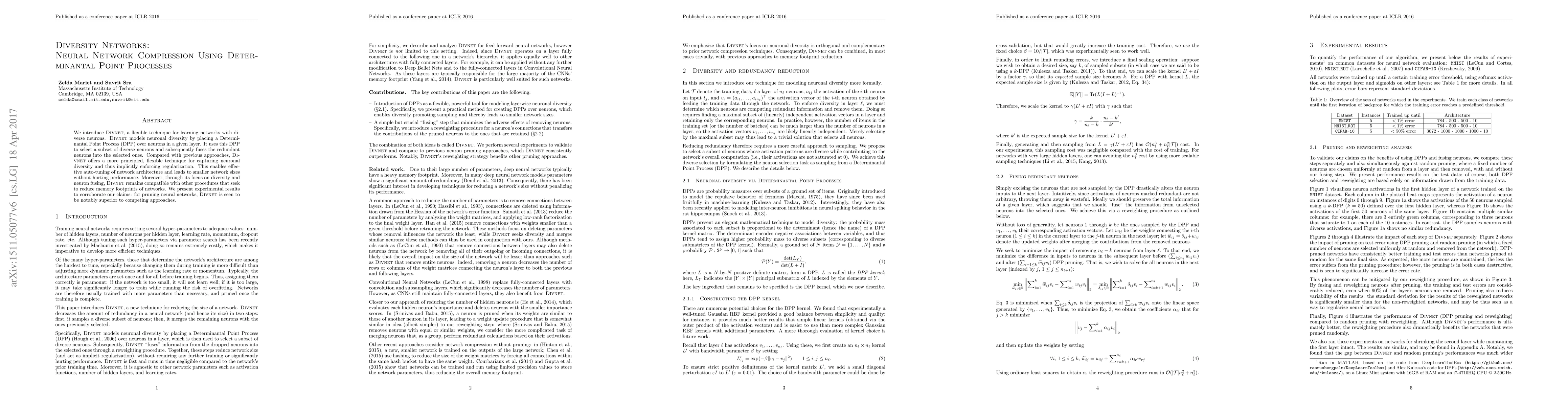 We introduce Divnet, a flexible technique for learning networks with diverse neurons. Divnet models neuronal diversity by placing a Determinantal Point Process (DPP) over neurons in a given layer. It uses this DPP to select a subset of diverse neurons and subsequently fuses the redundant neurons into the selected ones. Compared with previous approaches, Divnet offers a more principled, flexible technique for capturing neuronal diversity and thus implicitly enforcing regularization. This enables effective auto-tuning of network architecture and leads to smaller network sizes without hurting performance. Moreover, through its focus on diversity and neuron fusing, Divnet remains compatible with other procedures that seek to reduce memory footprints of networks. We present experimental results to corroborate our claims: for pruning neural networks, Divnet is seen to be notably superior to competing approaches.