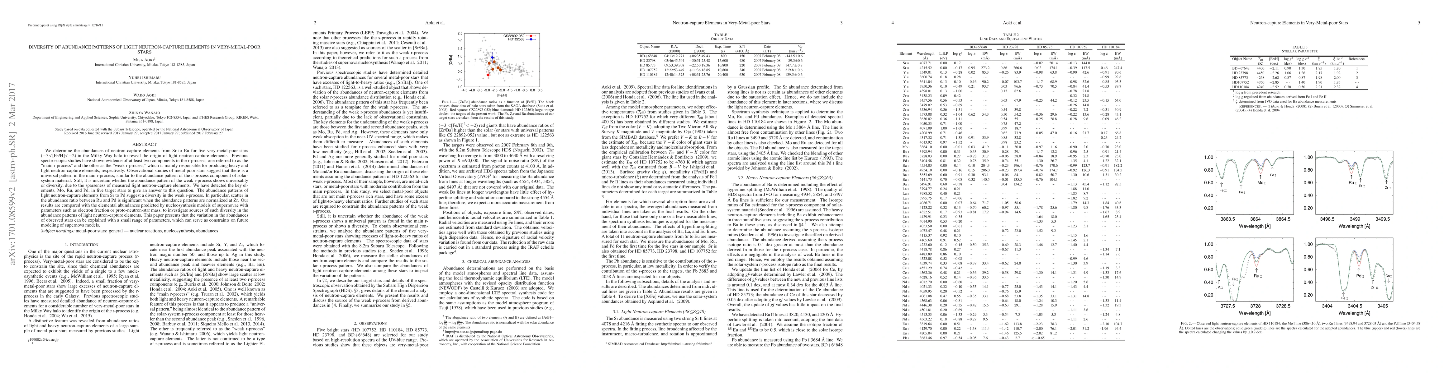 We determine the abundances of neutron-capture elements from Sr to Eu for five very-metal-poor stars (-3<[Fe/H]<-2) in the Milky Way halo to reveal the origin of light neutron-capture elements. Previous spectroscopic studies have shown evidence of at least two components in the r-process; one referred to as the "main r-process" and the other as the "weak r-process," which is mainly responsible for producing heavy and light neutron-capture elements, respectively. Observational studies of metal-poor stars suggest that there is a universal pattern in the main r-process, similar to the abundance pattern of the r-process component of solar-system material. Still, it is uncertain whether the abundance pattern of the weak r-process shows universality or diversity, due to the sparseness of measured light neutron-capture elements. We have detected the key elements, Mo, Ru, and Pd, in five target stars to give an answer to this question. The abundance patterns of light neutron-capture elements from Sr to Pd suggest a diversity in the weak r-process. In particular, scatter in the abundance ratio between Ru and Pd is significant when the abundance patterns are normalized at Zr. Our results are compared with the elemental abundances predicted by nucleosynthesis models of supernovae with parameters such as electron fraction or proto-neutron-star mass, to investigate sources of such diversity in the abundance patterns of light neutron-capture elements. This paper presents that the variation in the abundances of observed stars can be explained with a small range of parameters, which can serve as constraints on future modeling of supernova models.