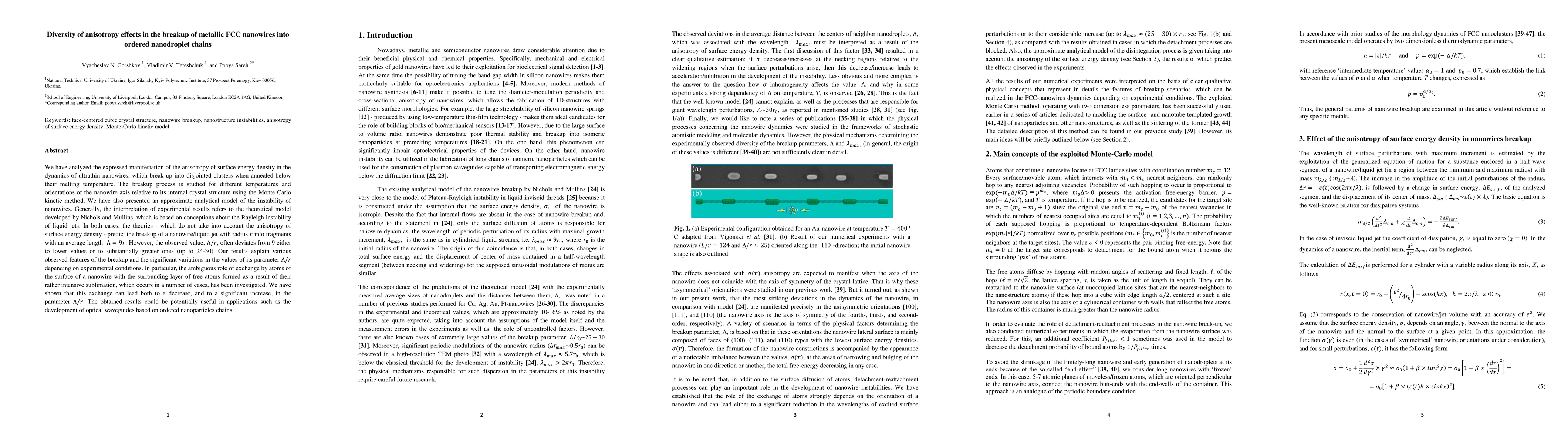 We have analyzed the expressed manifestation of the anisotropy of surface energy density in the dynamics of ultrathin nanowires, which break up into disjointed clusters when annealed below their melting temperature. The breakup process is studied for different temperatures and orientations of the nanowire axis relative to its internal crystal structure using the Monte Carlo kinetic method. We have also presented an approximate analytical model of the instability of nanowires. Generally, the interpretation of experimental results refers to the theoretical model developed by Nichols and Mullins, which is based on conceptions about the Rayleigh instability of liquid jets. In both cases, the theories - which do not take into account the anisotropy of surface energy density - predict the breakup of a nanowire/liquid jet with radius r into fragments with an average length {\Lambda}=9r. However, the observed value, {\Lambda}/r, often deviates from 9 either to lower values or to substantially greater ones (up to 24-30). Our results explain various observed features of the breakup and the significant variations in the values of its parameter {\Lambda}/r depending on experimental conditions. In particular, the ambiguous role of exchange by atoms of the surface of a nanowire with the surrounding layer of free atoms formed as a result of their rather intensive sublimation, which occurs in a number of cases, has been investigated. We have shown that this exchange can lead both to a decrease, and to a significant increase, in the parameter {\Lambda}/r. The obtained results could be potentially useful in applications such as the development of optical waveguides based on ordered nanoparticles chains.