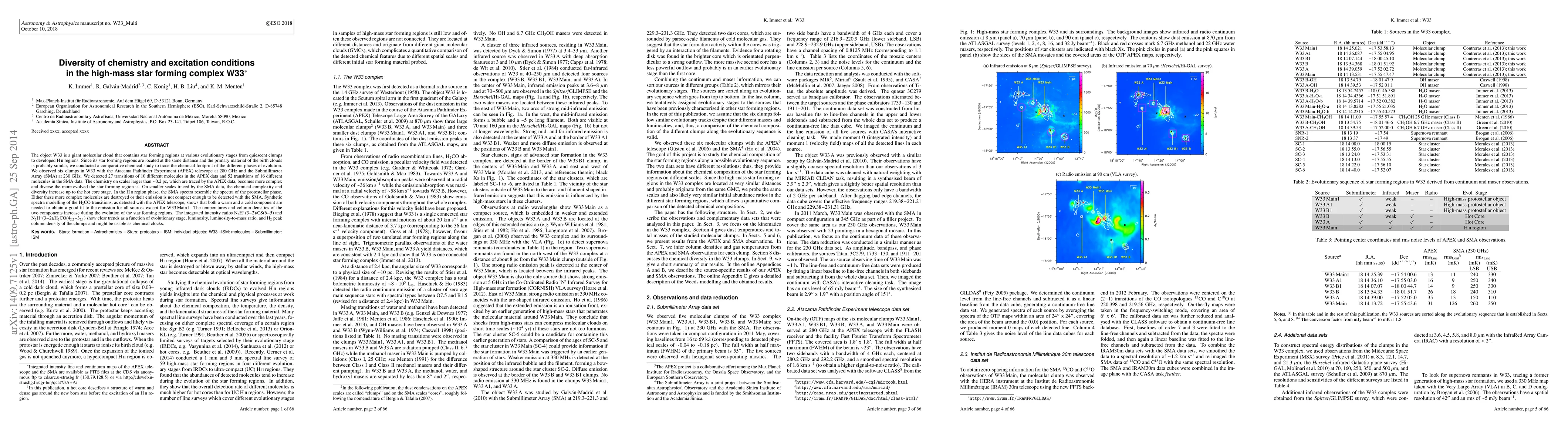 This study investigates the chemical diversity in the star-forming complex W33 using observations from the APEX and SMA telescopes. The research reveals that chemical complexity increases with the evolutionary stage of star-forming regions, suggesting that chemical clocks based on molecular ratios may track these stages.