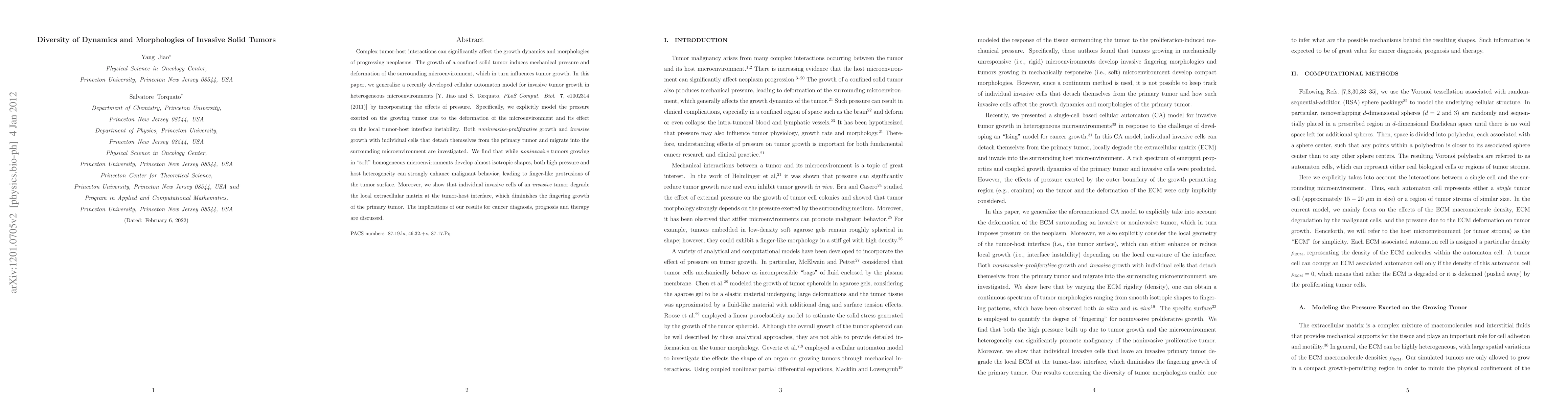 Complex tumor-host interactions can significantly affect the growth dynamics and morphologies of progressing neoplasms. The growth of a confined solid tumor induces mechanical pressure and deformation of the surrounding microenvironment, which in turn influences tumor growth. In this paper, we generalize a recently developed cellular automaton model for invasive tumor growth in heterogeneous microenvironments [Y. Jiao and S. Torquato, PLoS Comput. Biol. 7, e1002314 (2011)] by incorporating the effects of pressure. Specifically, we explicitly model the pressure exerted on the growing tumor due to the deformation of the microenvironment and its effect on the local tumor-host interface instability. Both noninvasive-proliferative growth and invasive growth with individual cells that detach themselves from the primary tumor and migrate into the surrounding microenvironment are investigated. We find that while noninvasive tumors growing in "soft" homogeneous microenvironments develop almost isotropic shapes, both high pressure and host heterogeneity can strongly enhance malignant behavior, leading to finger-like protrusions of the tumor surface. Moreover, we show that individual invasive cells of an invasive tumor degrade the local extracellular matrix at the tumor-host interface, which diminishes the fingering growth of the primary tumor. The implications of our results for cancer diagnosis, prognosis and therapy are discussed.
