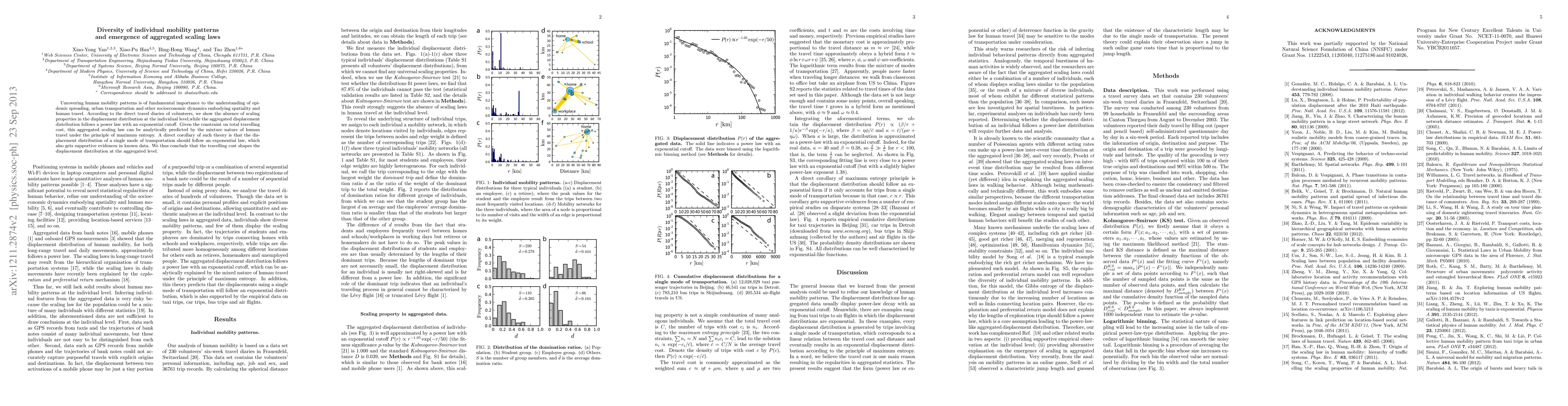 Uncovering human mobility patterns is of fundamental importance to the understanding of epidemic spreading, urban transportation and other socioeconomic dynamics embodying spatiality and human travel. According to the direct travel diaries of volunteers, we show the absence of scaling properties in the displacement distribution at the individual level,while the aggregated displacement distribution follows a power law with an exponential cutoff. Given the constraint on total travelling cost, this aggregated scaling law can be analytically predicted by the mixture nature of human travel under the principle of maximum entropy. A direct corollary of such theory is that the displacement distribution of a single mode of transportation should follow an exponential law, which also gets supportive evidences in known data. We thus conclude that the travelling cost shapes the displacement distribution at the aggregated level.