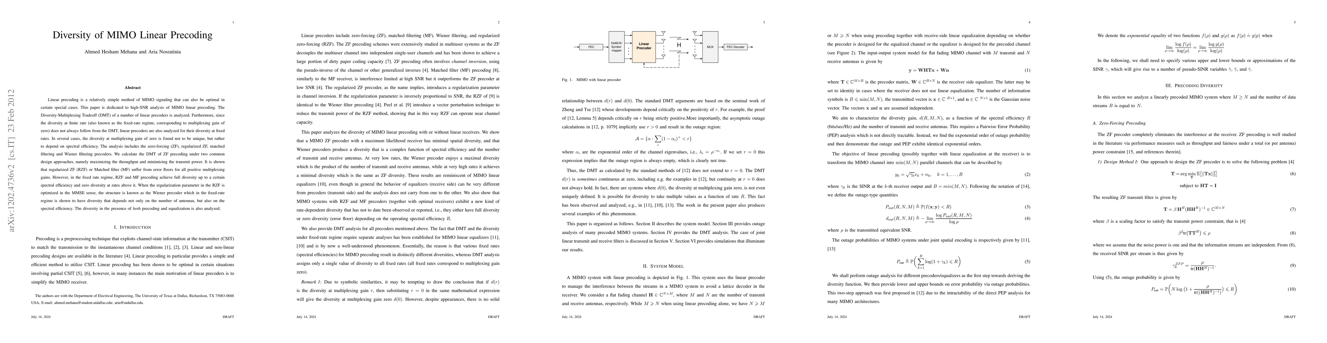 Linear precoding is a relatively simple method of MIMO signaling that can also be optimal in certain special cases. This paper is dedicated to high-SNR analysis of MIMO linear precoding. The Diversity-Multiplexing Tradeoff (DMT) of a number of linear precoders is analyzed. Furthermore, since the diversity at finite rate (also known as the fixed-rate regime, corresponding to multiplexing gain of zero) does not always follow from the DMT, linear precoders are also analyzed for their diversity at fixed rates. In several cases, the diversity at multiplexing gain of zero is found not to be unique, but rather to depend on spectral efficiency. The analysis includes the zero-forcing (ZF), regularized ZF, matched filtering and Wiener filtering precoders. We calculate the DMT of ZF precoding under two common design approaches, namely maximizing the throughput and minimizing the transmit power. It is shown that regularized ZF (RZF) or Matched filter (MF) suffer from error floors for all positive multiplexing gains. However, in the fixed rate regime, RZF and MF precoding achieve full diversity up to a certain spectral efficiency and zero diversity at rates above it. When the regularization parameter in the RZF is optimized in the MMSE sense, the structure is known as the Wiener precoder which in the fixed-rate regime is shown to have diversity that depends not only on the number of antennas, but also on the spectral efficiency. The diversity in the presence of both precoding and equalization is also analyzed.