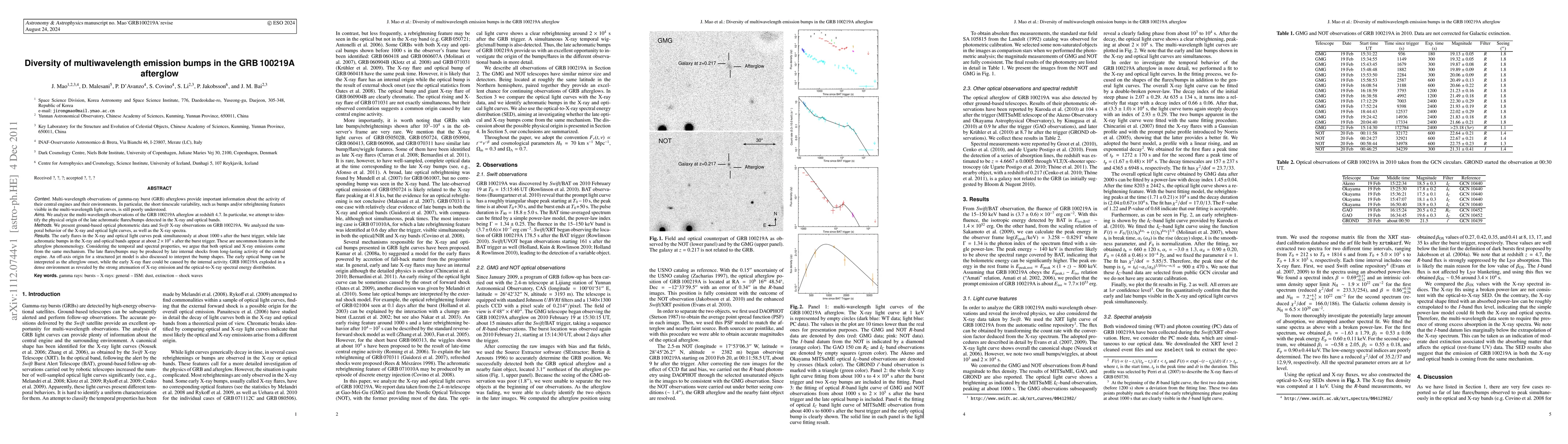 Context. Multi-wavelength observations of gamma-ray burst (GRB) afterglows provide important information about the activity of their central engines and their environments. In particular, the short timescale variability, such as bumps and/or rebrightening features visible in the multi-wavelength light curves, is still poorly understood. Aims. We analyze the multi-wavelength observations of the GRB100219A afterglow at redshift 4.7. In particular, we attempt to identify the physical origin of the late achromatic flares/bumps detected in the X-ray and optical bands. Methods. We present ground-based optical photometric data and Swift X-ray observations on GRB100219A. We analyzed the temporal behavior of the X-ray and optical light curves, as well as the X-ray spectra. Results. The early flares in the X-ray and optical light curves peak simultaneously at about 1000 s after the burst trigger, while late achromatic bumps in the X-ray and optical bands appear at about 20000 s after the burst trigger. These are uncommon features in the afterglow phenomenology. Considering the temporal and spectral properties, we argue that both optical and X-ray emissions come from the same mechanism. The late flares/bumps may be produced by late internal shocks from long-lasting activity of the central engine. An off-axis origin for a structured jet model is also discussed to interpret the bump shapes. The early optical bump can be interpreted as the afterglow onset, while the early X-ray flare could be caused by the internal activity. GRB 100219A exploded in a dense environment as revealed by the strong attenuation of X-ray emission and the optical-to-X-ray spectral energy distribution.