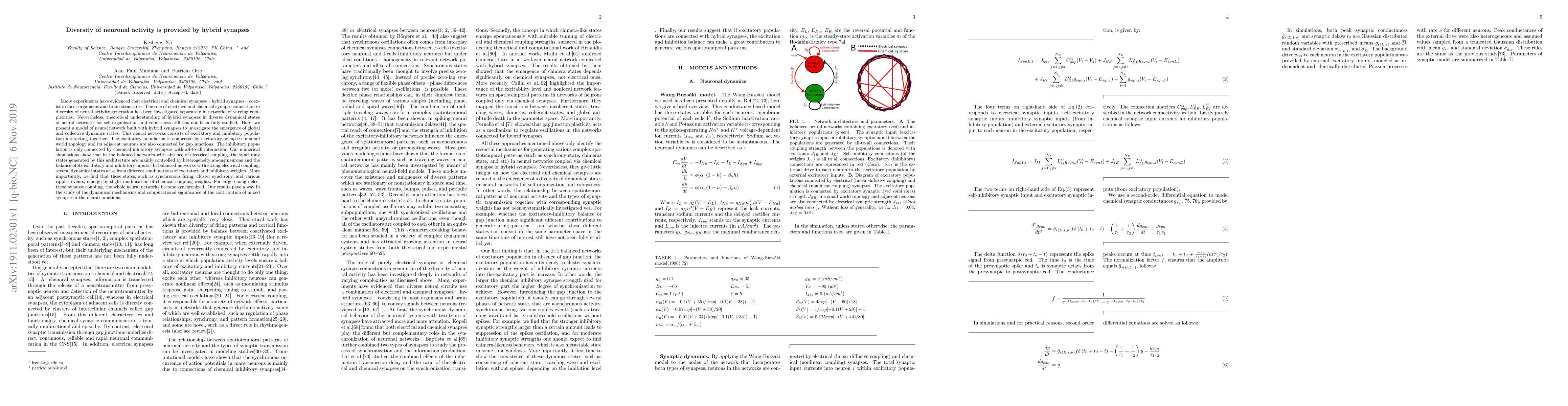 This paper explores neural networks with hybrid synapses, combining electrical and chemical connections, to investigate their role in generating diverse neural activity. The study reveals that varying the strength of electrical coupling and the balance of excitatory and inhibitory inputs can lead to different dynamical states, including synchronous firing, cluster synchrony, and ripples, highlighting the computational significance of mixed synapse contributions.