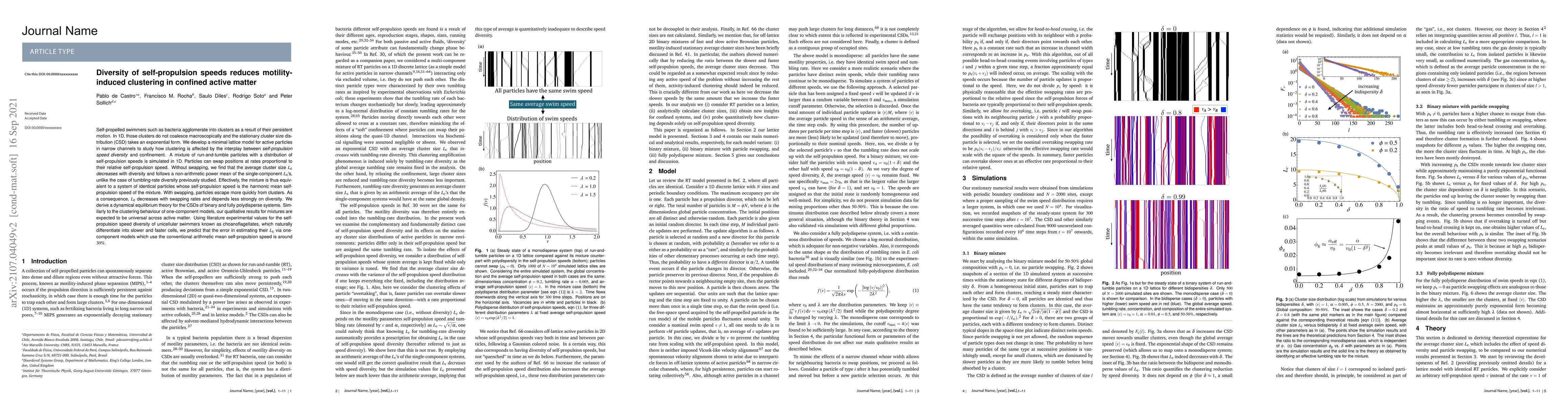 Self-propelled swimmers such as bacteria agglomerate into clusters as a result of their persistent motion. In 1D, those clusters do not coalesce macroscopically and the stationary cluster size distribution (CSD) takes an exponential form. We develop a minimal lattice model for active particles in narrow channels to study how clustering is affected by the interplay between self-propulsion speed diversity and confinement. A mixture of run-and-tumble particles with a distribution of self-propulsion speeds is simulated in 1D. Particles can swap positions at rates proportional to their relative self-propulsion speed. Without swapping, we find that the average cluster size $L_\text{c}$ decreases with diversity and follows a non-arithmetic power mean of the single-component $L_\text{c}$'s, unlike the case of tumbling-rate diversity previously studied. Effectively, the mixture is thus equivalent to a system of identical particles whose self-propulsion speed is the harmonic mean self-propulsion speed of the mixture. With swapping, particles escape more quickly from clusters. As a consequence, $L_\text{c}$ decreases with swapping rates and depends less strongly on diversity. We derive a dynamical equilibrium theory for the CSDs of binary and fully polydisperse systems. Similarly to the clustering behaviour of one-component models, our qualitative results for mixtures are expected to be universal across active matter. Using literature experimental values for the self-propulsion speed diversity of unicellular swimmers known as choanoflagellates, which naturally differentiate into slower and faster cells, we predict that the error in estimating their $L_\text{c}$ via one-component models which use the conventional arithmetic mean self-propulsion speed is around $30\%$.