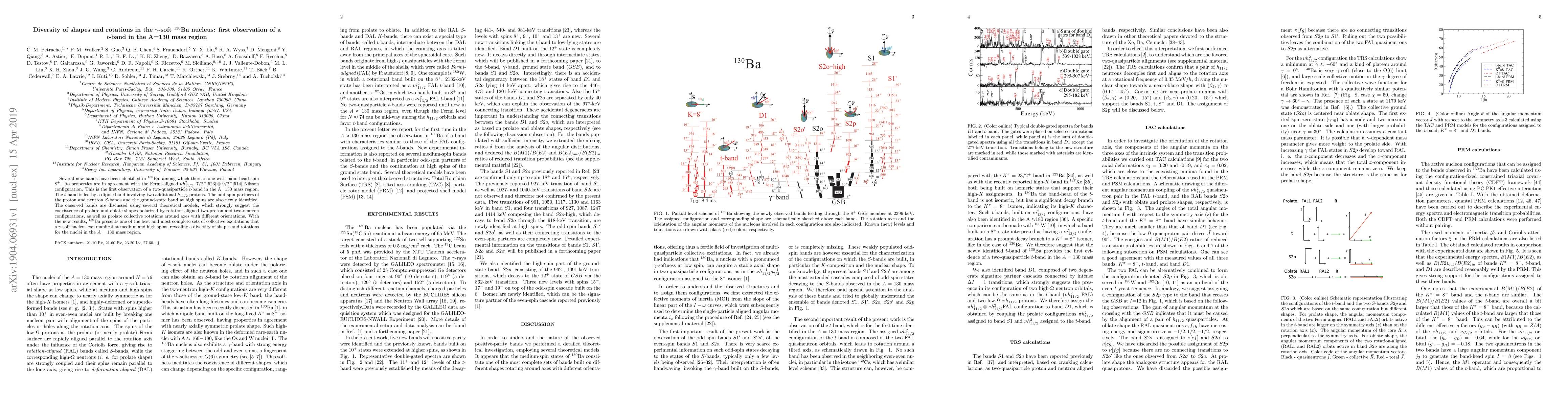 Several new bands have been identified in 130Ba, among which there is one with band-head spin 8+. Its properties are in agreement with the Fermi-aligned \nu h11/2^2 , 7/2+[523] \otimes 9/2-[514] Nilsson configuration. This is the first observation of a two-quasiparticle t-band in the A=130 mass region. The t-band is fed by a dipole band involving two additional h11/2 protons. The odd-spin partners of the proton and neutron S-bands and the ground-state band at high spins are also newly identified. The observed bands are discussed using several theoretical models, which strongly suggest the coexistence of prolate and oblate shapes polarized by rotation aligned two-proton and two-neutron configurations, as well as prolate collective rotations around axes with different orientations. With the new results, 130Ba presents one of the best and most complete sets of collective excitations that a gamma-soft nucleus can manifest at medium and high spins, revealing a diversity of shapes and rotations for the nuclei in the A = 130 mass region.