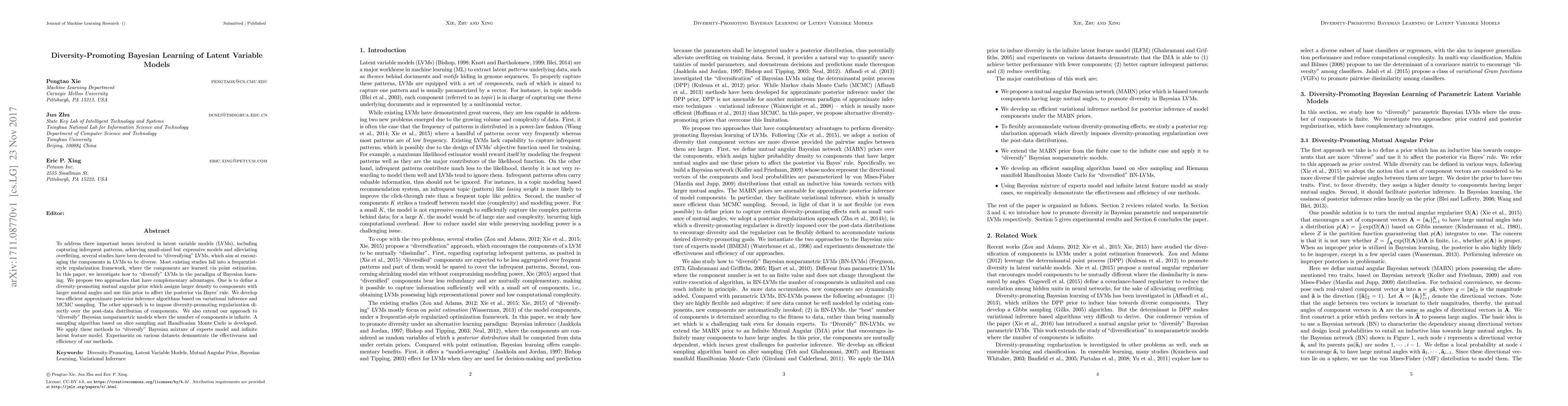 This paper proposes Bayesian learning methods to diversify latent variable models, addressing infrequent patterns, model size, and overfitting. It introduces a diversity-promoting mutual angular prior and regularization over post-data distributions, with efficient inference algorithms for both finite and infinite component models. Experiments show the effectiveness of these approaches.