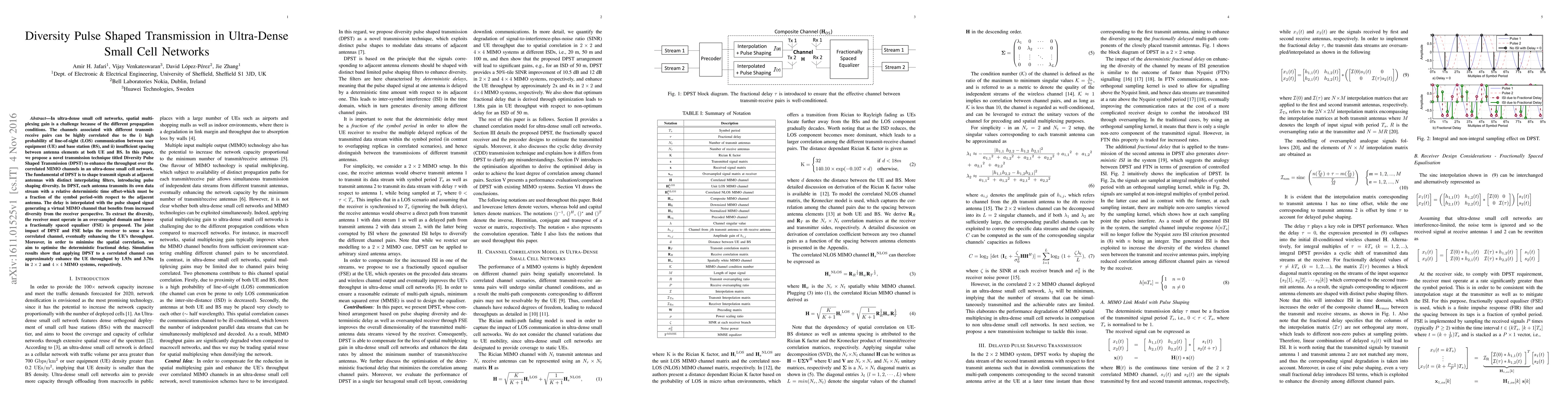 This paper proposes Diversity Pulse Shaped Transmission (DPST) to enhance throughput in ultra-dense small cell networks by introducing pulse shaping diversity through distinct interpolating filters and fractional time delays between adjacent antennas. The use of a fractionally spaced equaliser (FSE) at the receiver further reduces channel correlation, significantly boosting user equipment throughput by up to 3.76x in 4x4 MIMO systems.