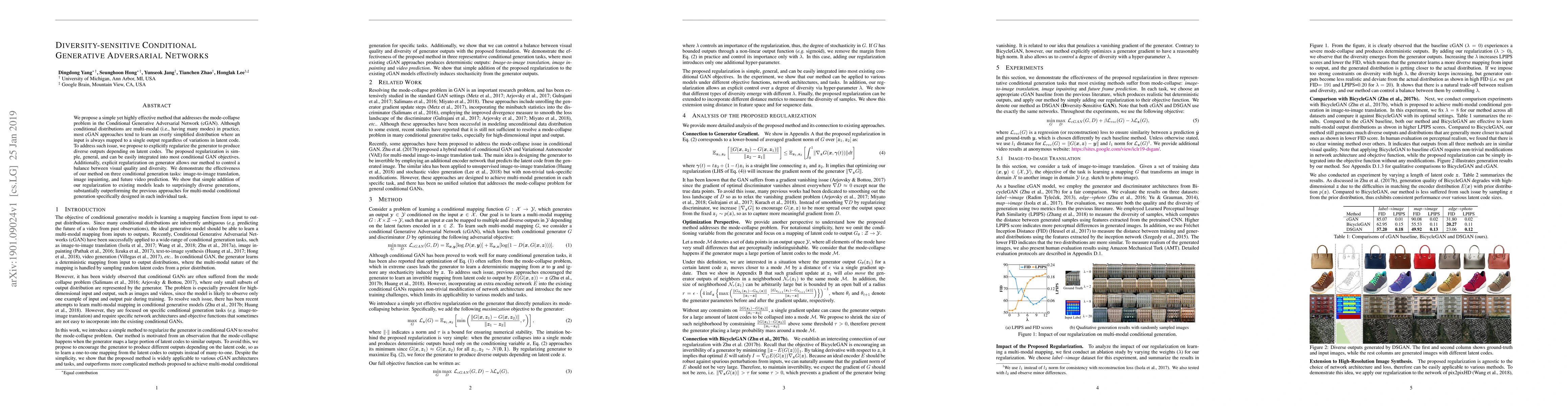 This paper proposes a regularization method to address mode-collapse in Conditional Generative Adversarial Networks (cGANs), enhancing diversity in generated outputs. The method effectively balances visual quality with diversity and outperforms previous multi-modal generation approaches in tasks like image-to-image translation, image inpainting, and future video prediction.