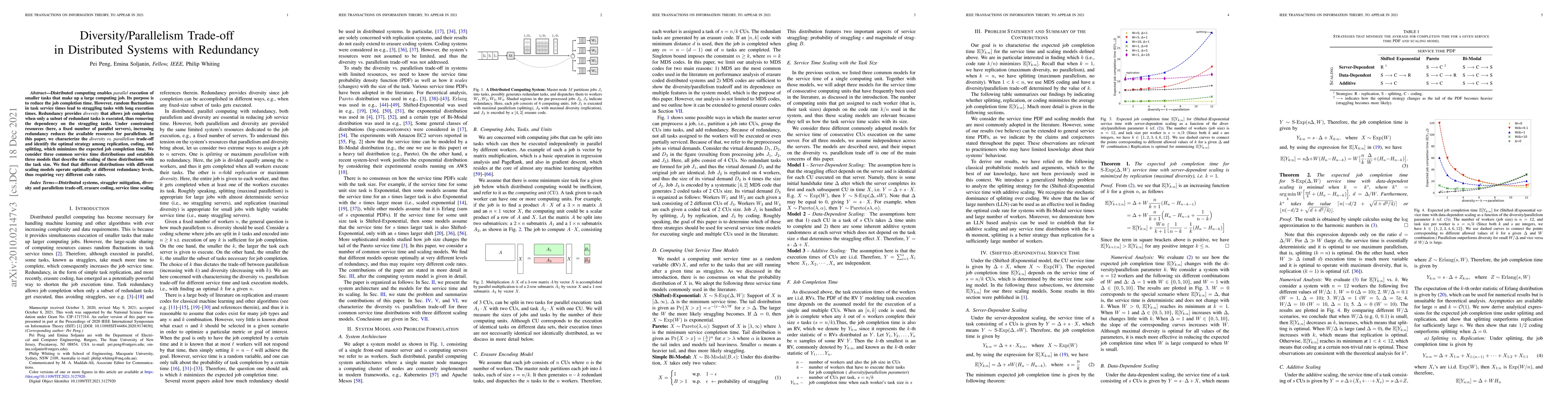 As numerous machine learning and other algorithms increase in complexity and data requirements, distributed computing becomes necessary to satisfy the growing computational and storage demands, because it enables parallel execution of smaller tasks that make up a large computing job. However, random fluctuations in task service times lead to straggling tasks with long execution times. Redundancy, in the form of task replication and erasure coding, provides diversity that allows a job to be completed when only a subset of redundant tasks is executed, thus removing the dependency on the straggling tasks. In situations of constrained resources (here a fixed number of parallel servers), increasing redundancy reduces the available resources for parallelism. In this paper, we characterize the diversity vs. parallelism trade-off and identify the optimal strategy, among replication, coding and splitting, which minimizes the expected job completion time. We consider three common service time distributions and establish three models that describe scaling of these distributions with the task size. We find that different distributions with different scaling models operate optimally at different levels of redundancy, and thus may require very different code rates.
