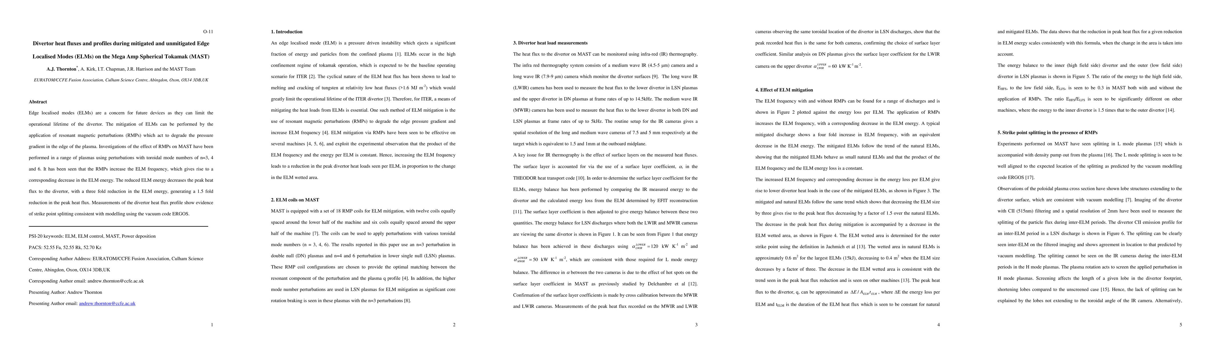 Research on MAST found that applying resonant magnetic perturbations reduces ELM energy by 3x, resulting in a 1.5 fold decrease in peak heat flux to the divertor.