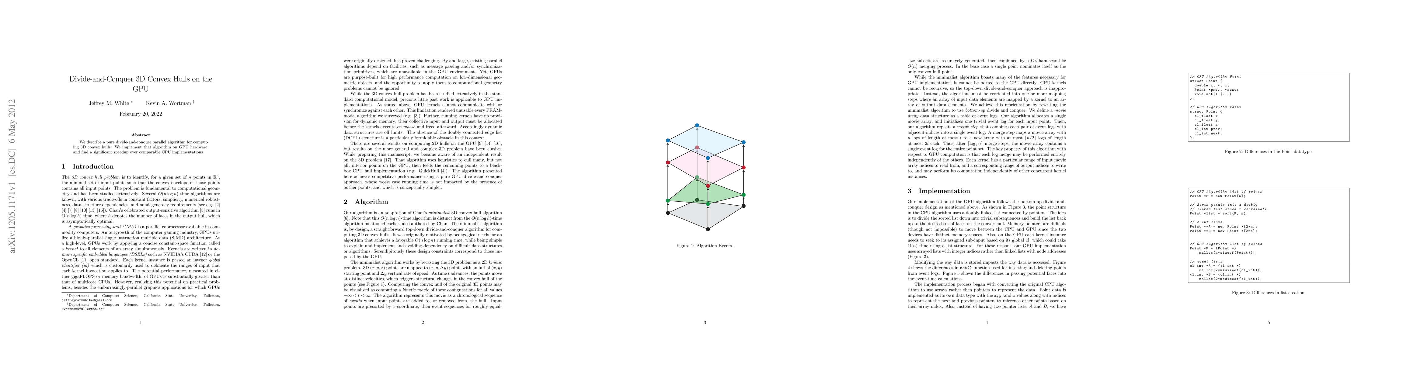 This paper presents a parallel divide-and-conquer algorithm for computing 3D convex hulls, implemented on GPU hardware, achieving significant speedup compared to CPU-based implementations. The GPU implementation leverages parallel processing to efficiently handle large datasets.