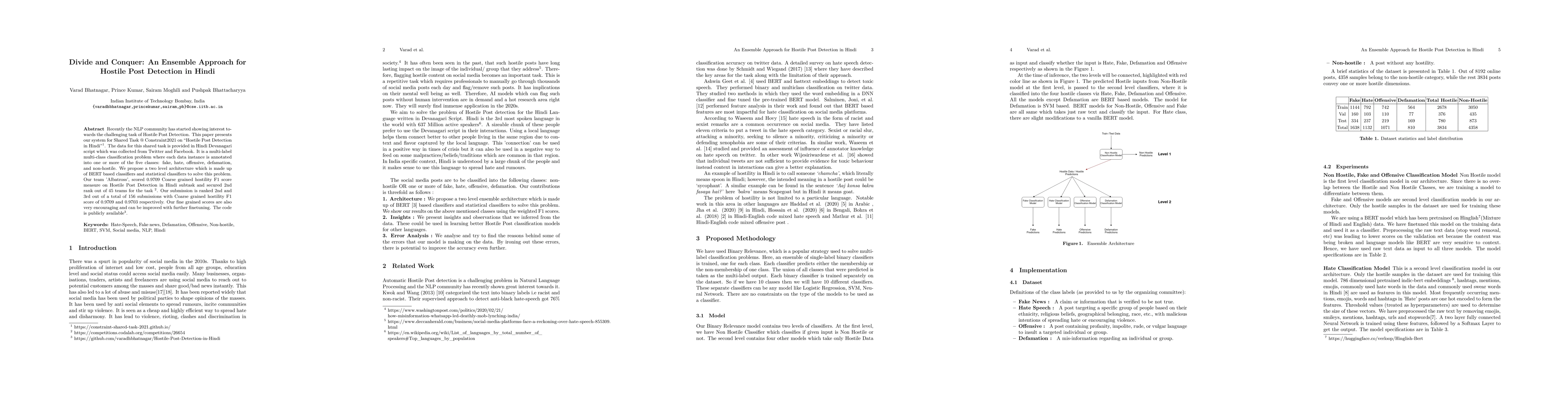 Recently the NLP community has started showing interest towards the challenging task of Hostile Post Detection. This paper present our system for Shared Task at Constraint2021 on "Hostile Post Detection in Hindi". The data for this shared task is provided in Hindi Devanagari script which was collected from Twitter and Facebook. It is a multi-label multi-class classification problem where each data instance is annotated into one or more of the five classes: fake, hate, offensive, defamation, and non-hostile. We propose a two level architecture which is made up of BERT based classifiers and statistical classifiers to solve this problem. Our team 'Albatross', scored 0.9709 Coarse grained hostility F1 score measure on Hostile Post Detection in Hindi subtask and secured 2nd rank out of 45 teams for the task. Our submission is ranked 2nd and 3rd out of a total of 156 submissions with Coarse grained hostility F1 score of 0.9709 and 0.9703 respectively. Our fine grained scores are also very encouraging and can be improved with further finetuning. The code is publicly available.
