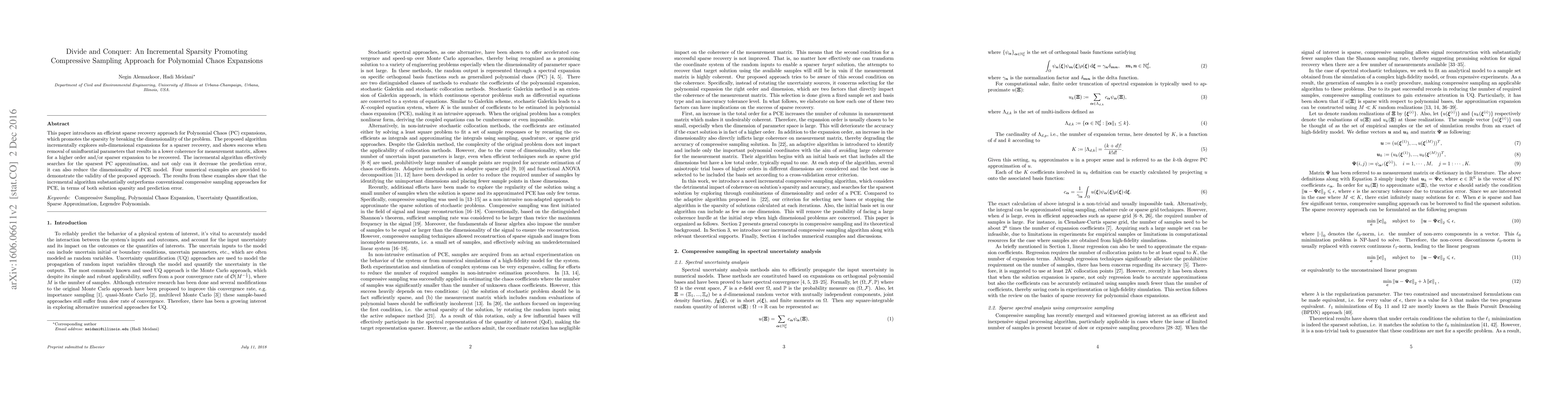 This paper proposes an incremental sparsity-promoting compressive sampling method for Polynomial Chaos Expansions (PCE), which effectively reduces dimensionality and improves recovery accuracy by iteratively removing uninfluential parameters. The approach outperforms conventional methods in both sparsity and prediction error, as demonstrated by four numerical examples.