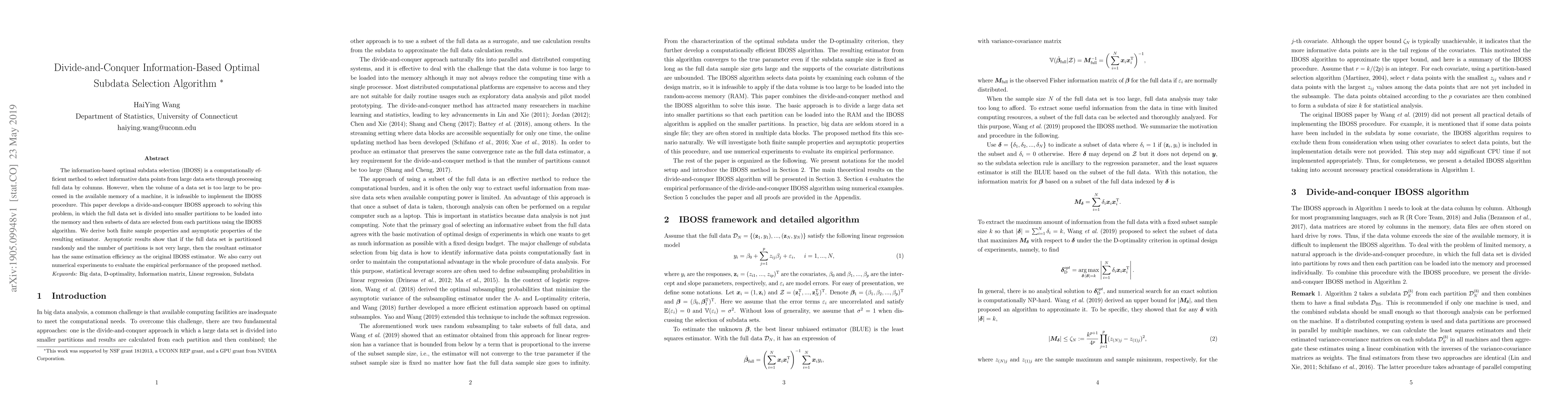 A divide-and-conquer approach is proposed to efficiently select informative data points from large datasets when memory constraints apply. The method divides the dataset into smaller partitions, selects subsets using an information-based optimal subdata selection algorithm, and achieves similar estimation efficiency as the original algorithm.