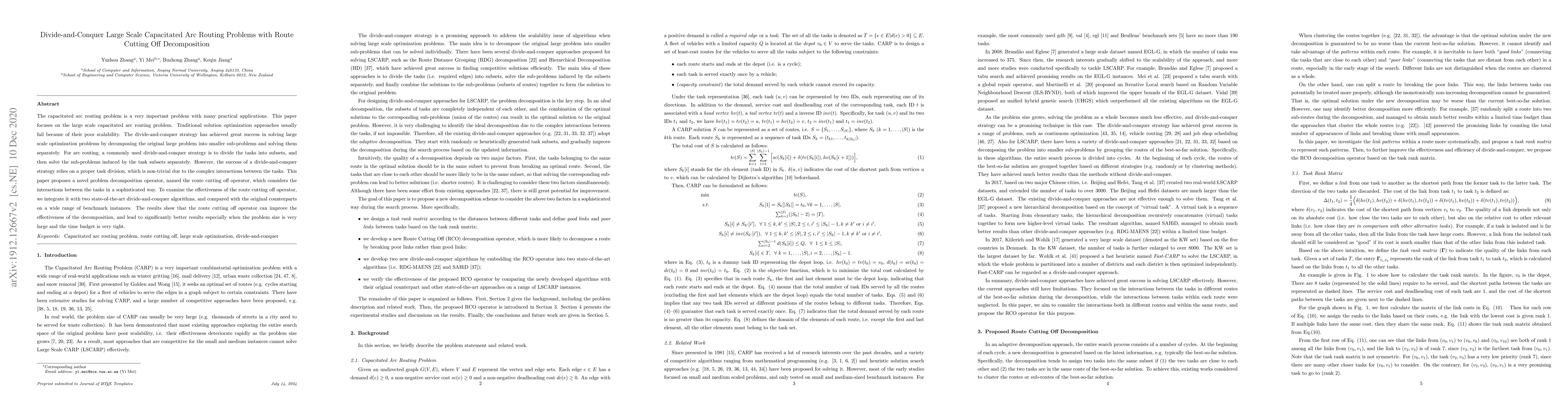 This paper proposes a novel route cutting off operator to decompose large scale capacitated arc routing problems using a divide-and-conquer strategy, which improves upon traditional approaches by better managing task interactions. The method is shown to significantly outperform existing algorithms on benchmark instances, especially for large problems with tight time constraints.